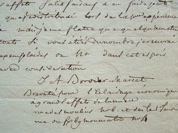 Bordier-Marcet vient de tester avec succès, à l'église Saint-Roch, son nouveau système d'éclairage par lampes astrales. Il s'adresse au journal pour en faire la publicité. «L'essai que j'ai fait cet automne dans l'église de St Roch pour l'éclairage avec des lampes astrales a paru assez satisfaisant à son respectable curé, M. Marduel, pour lui faire désirer un essai plus complet et je me suis empressé de l'effectuer. Mes fonctions de cette nuit et celles de la semaine sainte seront donc servies par ce nouvel éclairage religieux et les dispositions que j'ai prises me font espérer qu'il paraîtra digne du sujet et de la majesté du lieu [...]».