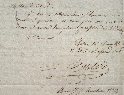Lettre consacrée à la publication de sa traduction annotée des Métamorphoes d'Ovide, en 24 livraisons. Il reproche à son éditeur de ne pas s'être engagé par écrit comme il l'avait promis. Boulard s'engage à remettre les manuscrits à dates fixes pour l'impression et la correction des 4 dernières livraisons.