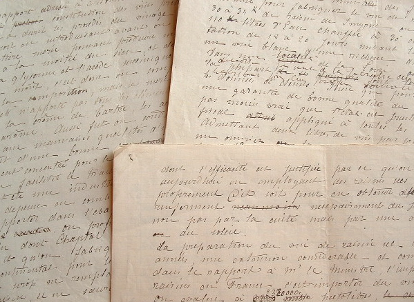 Jean Baptiste Boussingault (Paris, 1802/1887)Notes de Boussingault en complément d'un rapport remis au ministre de l'Agriculture sur les procédés de vinification observés à l'Exposition internationale, par addition d'alcool ou adjonction «d'une matière mérée pouvant produire un poids d'alcool à peu près égal à la moitié du sien». Boussingault montre que ces méthodes n'améliorent pas la qualité d'un vin. Par contre, il se soucie de l'importation grandissante de raisins étrangers, très sucrés, en particulier de Corinthe, qui menacent l'économie nationale. Il étudie différentes variétés (Malaga, Corinthe, Smyrne, etc.) sur le rapport de leur rendement en alcool. Il réalise une expérience de fermentation et note, durant les 15 jours, ses observations.