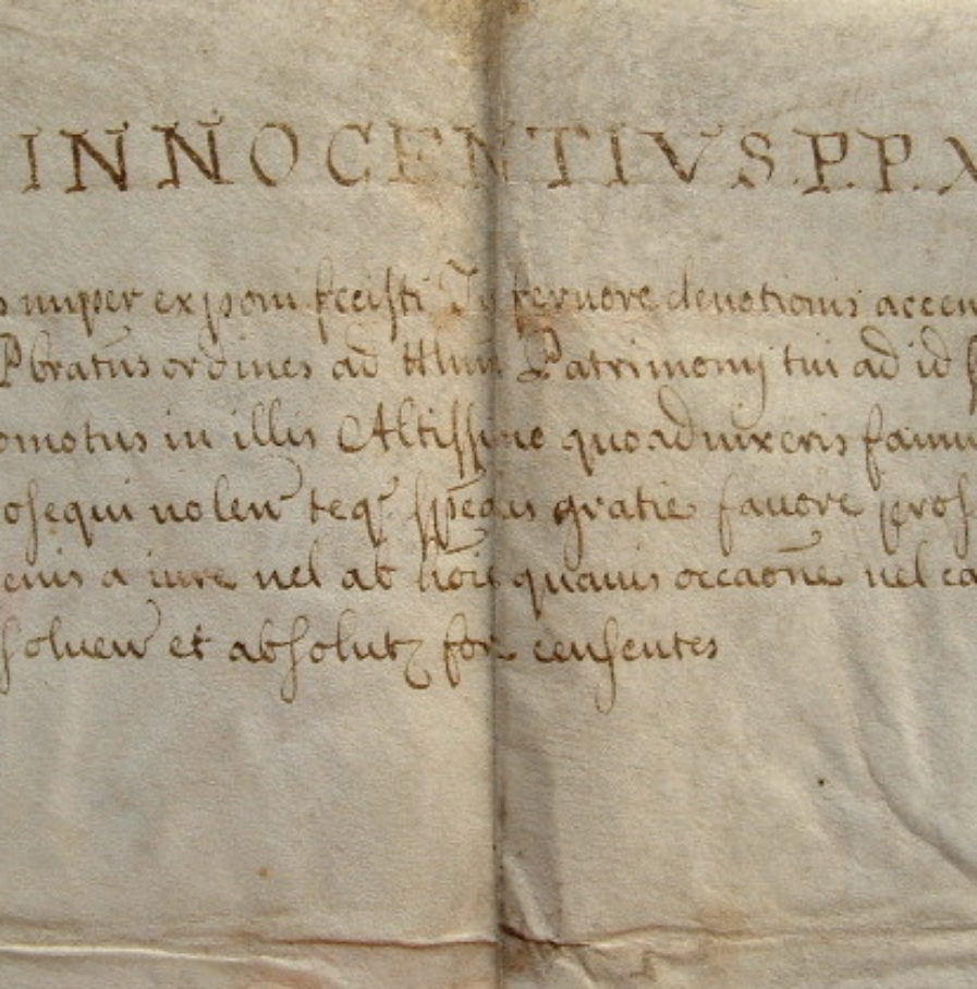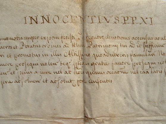 Bref du pape Innocent XI [souverain pontife de 1676 à 1689] en faveur de Pierre Ronce, clerc du diocèse de Bâle, en Suisse, pour sa promotion aux ordres sacrés. Le document est signé par Franciscus Liberati (1615/1703), archevêque d'Ephèse (en 1688).