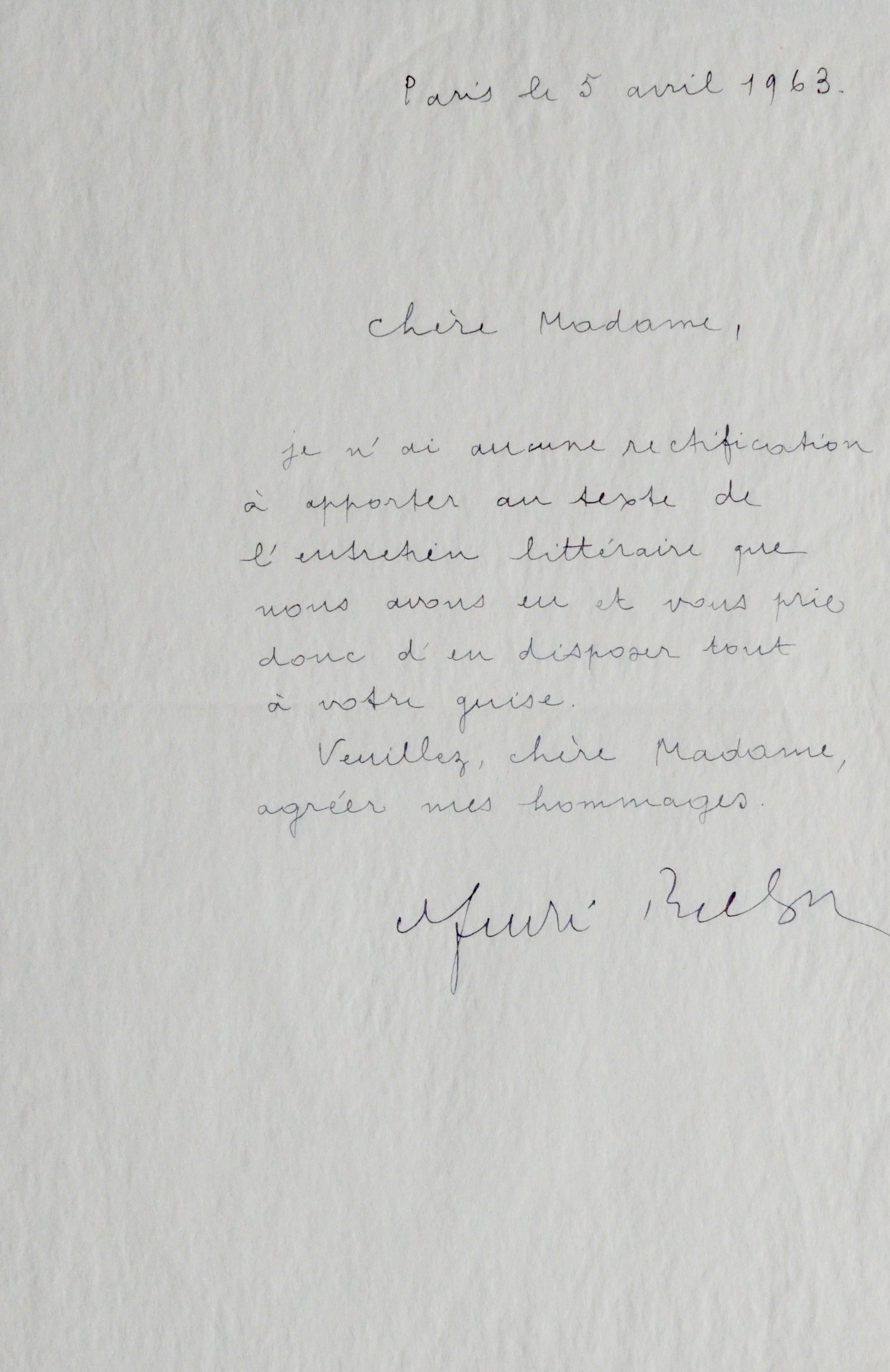 "[…] Je n'ai aucune rectification à apporter au texte de l'entretien littéraire que nous avons eu et vous prie donc d'en disposer à votre guise [...]."