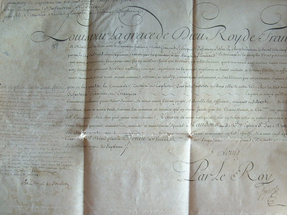 Brevet de capitaine en second de la compagnie de Favas dans le régiment d'infanterie du Perche, accordé à Antoine Nicolas François de Porquier Dufresnoy. Le document, en partie imprimé, est signé par Louis XVI (secrétaire de la main), le maréchal de Ségur et le prince de Condé "colonel général de notre infanterie françoise et étrangère".