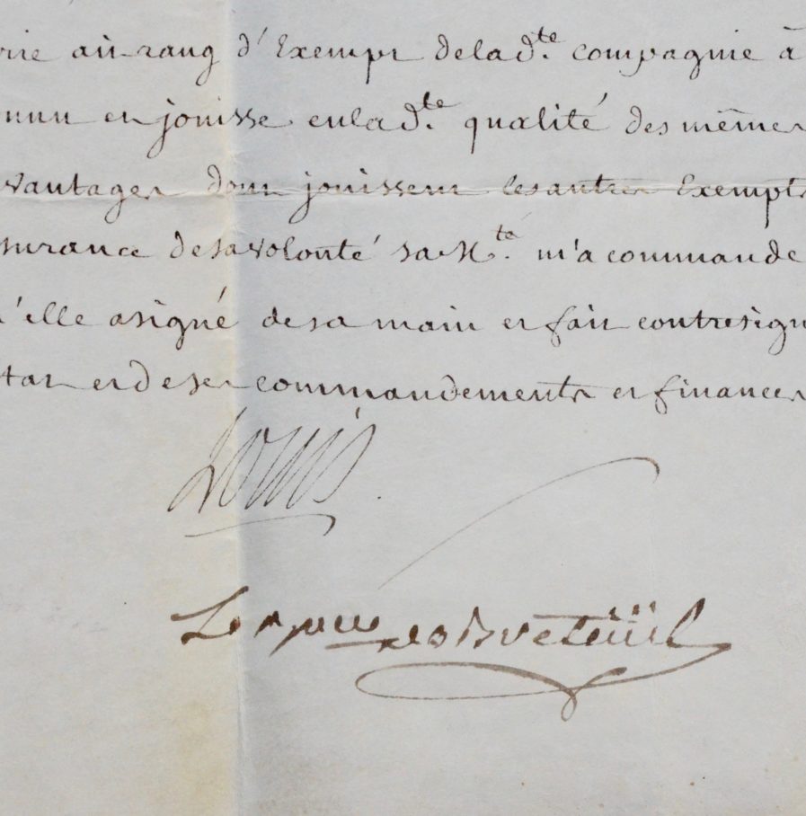 Brevet d'exemption pour le Sieur Thomas Gabriel Baudry de La Poterie, de la Compagnie des Cent Suisses, de la garde ordinaire du Roi.