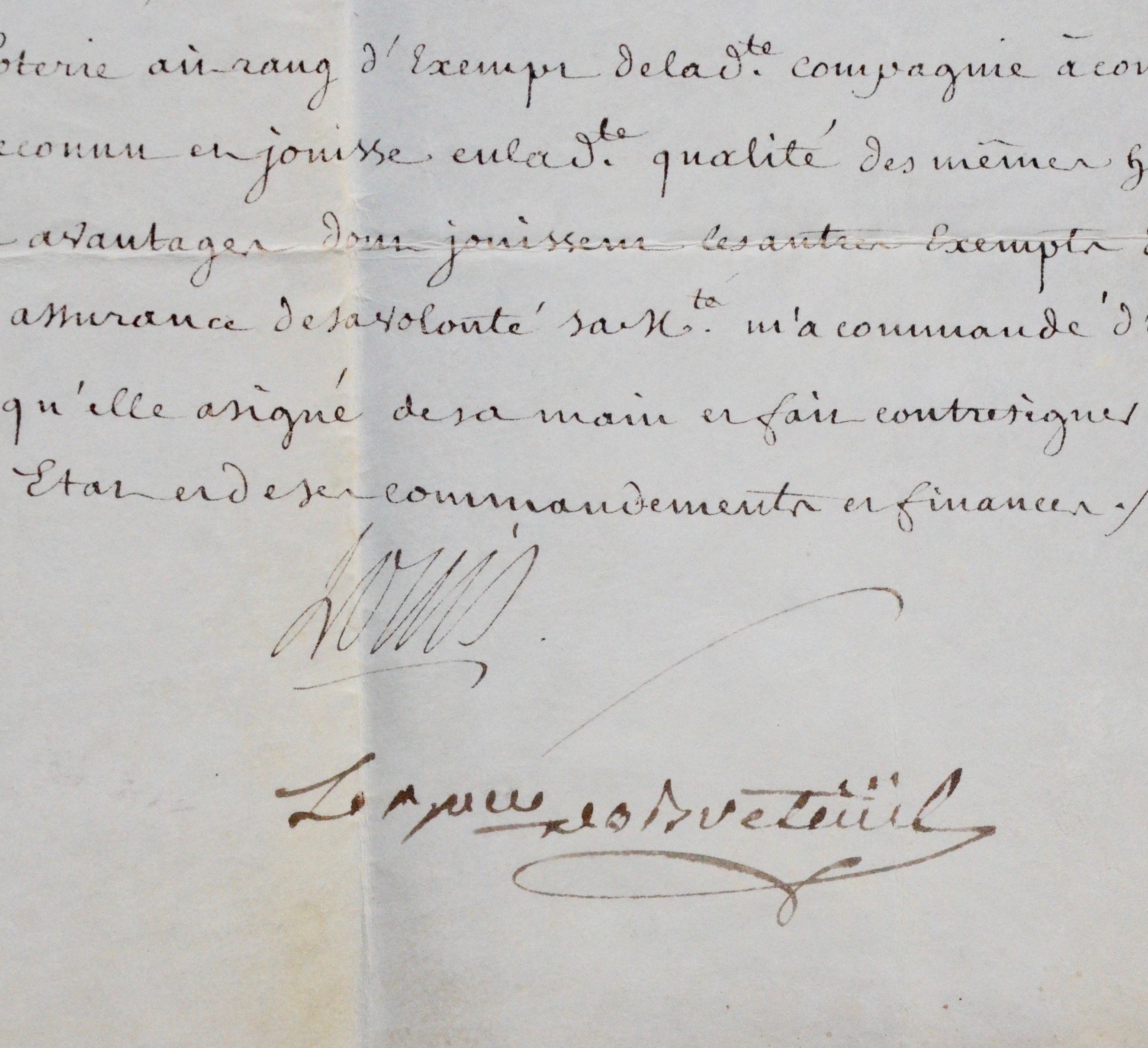 Manuscrit sur parchemin signé par Louis XVI (secrétaire de la main) et contresigné par le baron de Breteuil.