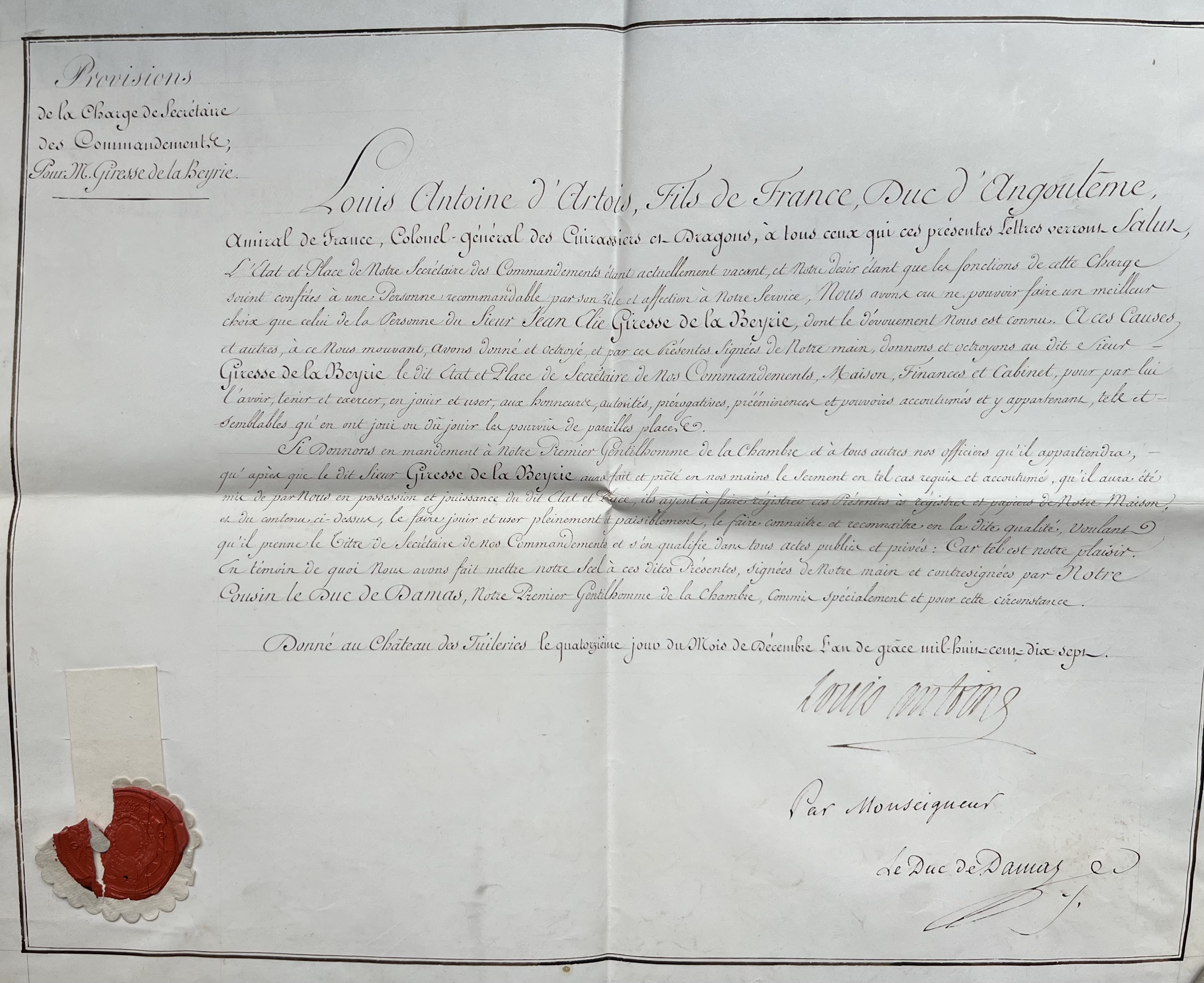 Brevet sur vélin, octroyant la charge de secrétaire des commandements à Jean-Élie Giresse de La Beyrie. Signé par Louis-Antoine d'Angoulême, fils du futur Charles X. Beau document.