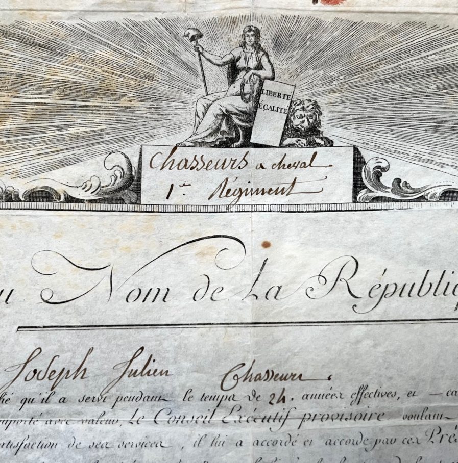 Brevet gravé sur vélin, complété à l'encre, autorisant le citoyen Joseph Julien, chasseur à cheval, à porter "sur le côté gauche de son habit, à la hauteur de la troisième boutonnière, le Médaillon des deux Epées en sautoir, des couleurs et de la forme ci empreintes [...]". Signature (griffe) de Jean-Baptiste Bouchotte (1754-1840).