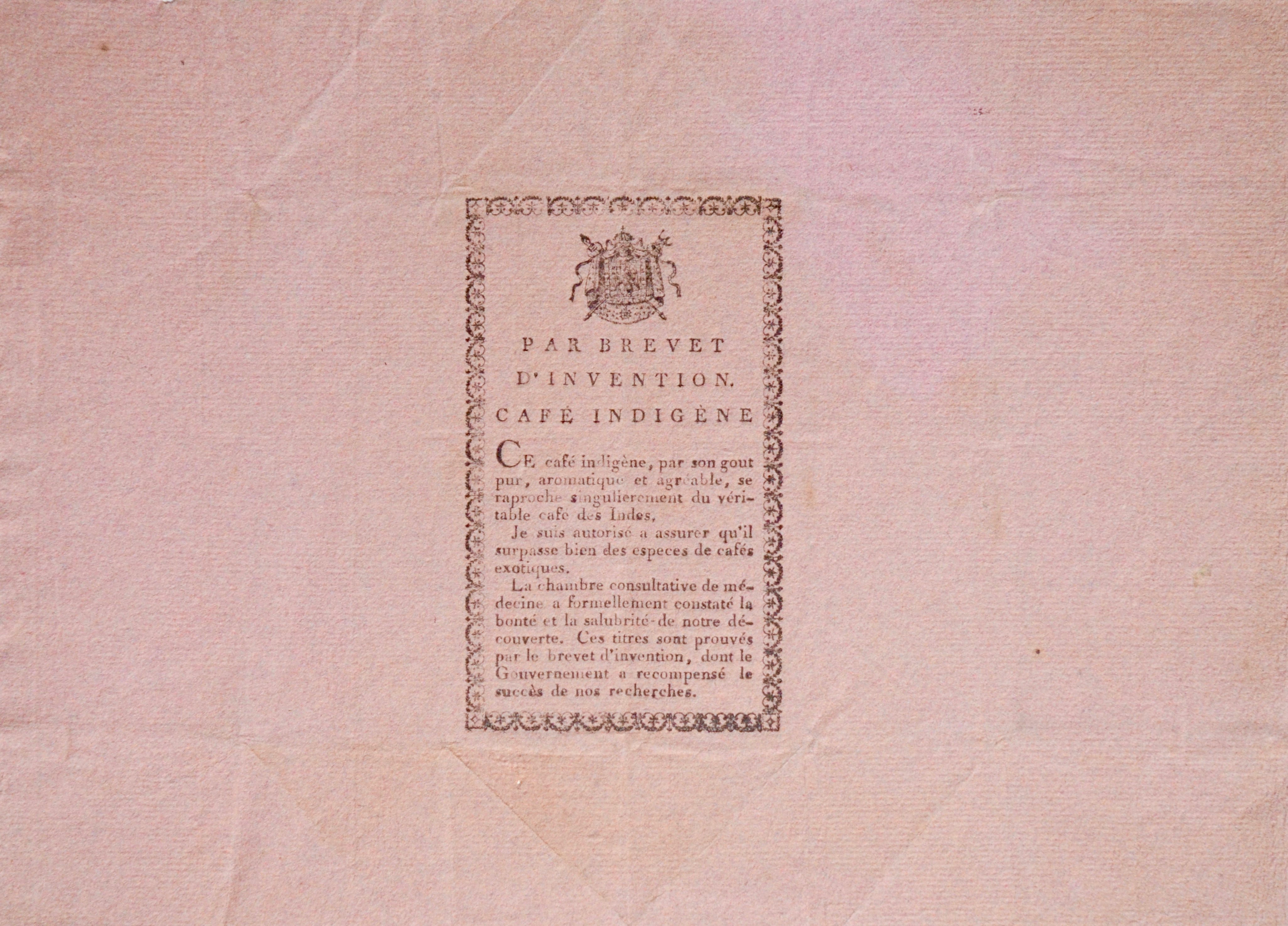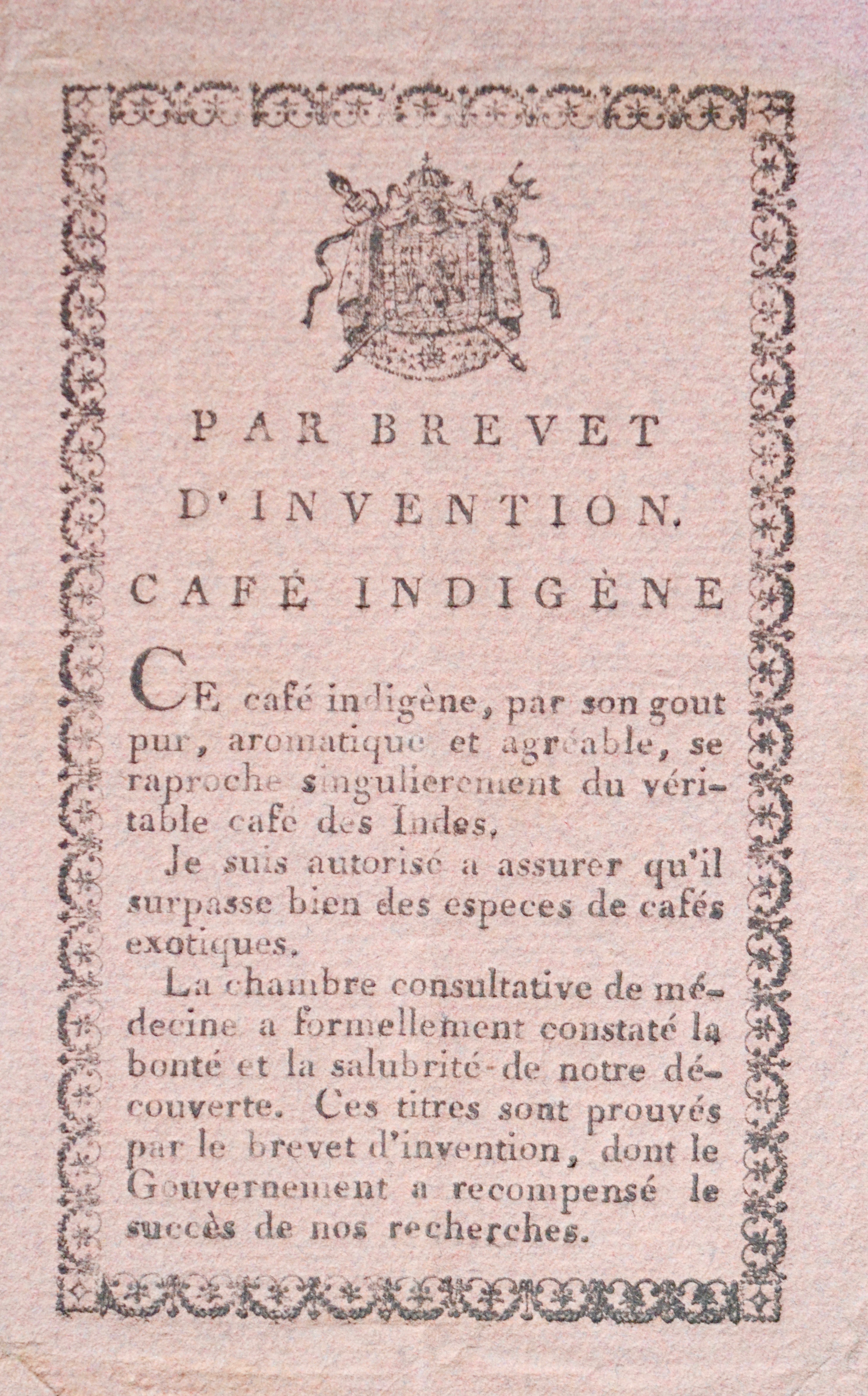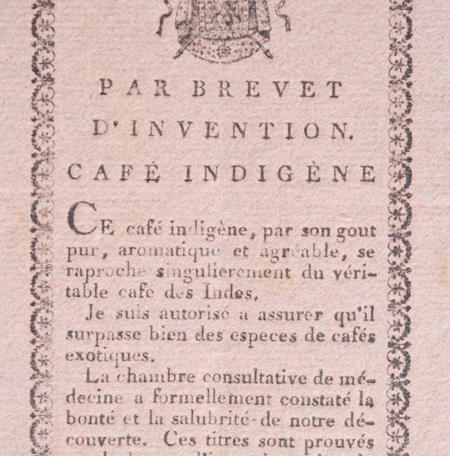 "Ce café indigène, par son gout pur, aromatique et agréable, se rapproche singulièrement du véritable café des Indes. Je suis autorisé à assurer qu'il surpasse bien des espèces de cafés exotiques. La chambre consultative de médecine a formellement constaté la bonté et la salubrité de notre découverte. Ces titres sont prouvés par le brevet d'invention, dont le gouvernement a récompensé le succès de nos recherches".