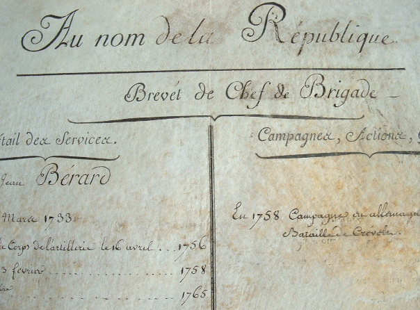 Brevet de chef de brigade décerné au citoyen Jean Bérard, né en 1733, qui a participé à la bataille de Crévele, en Allemagne, en 1758.