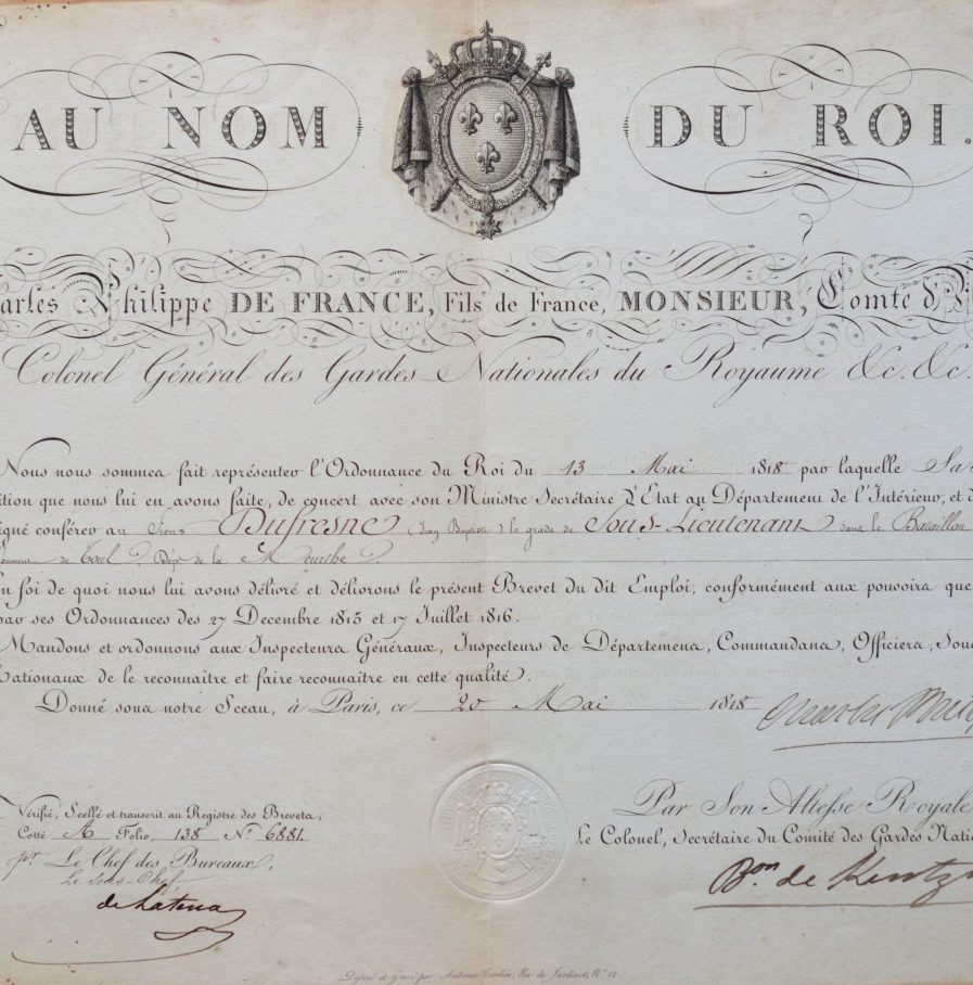 Brevet de sous-lieutenant dans le bataillon de la Garde Nationale à pied de l'arrondissement de Toul, accordé par le comte d'Artois (futur Charles X), à Jean-Baptiste Dufresne.