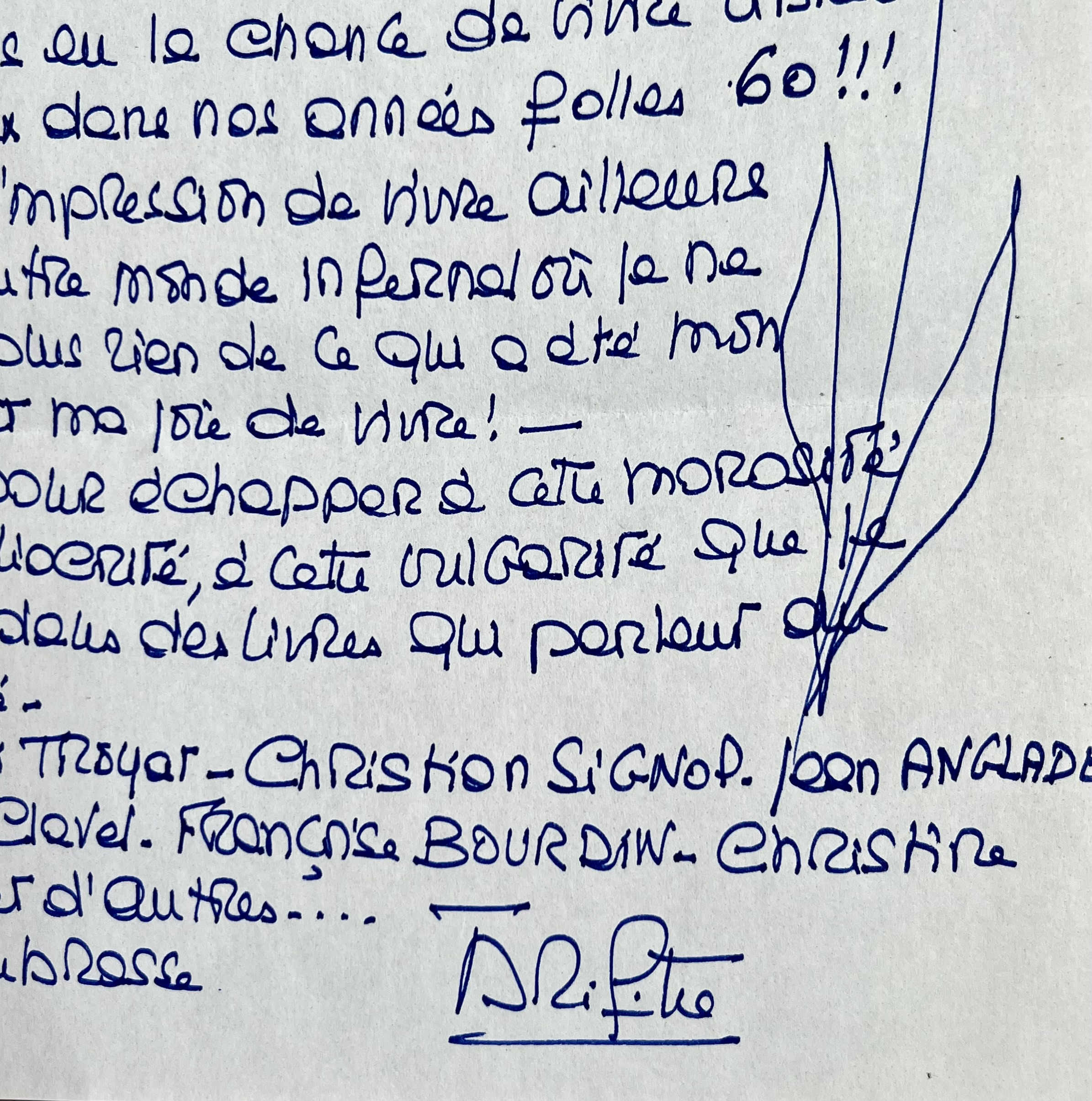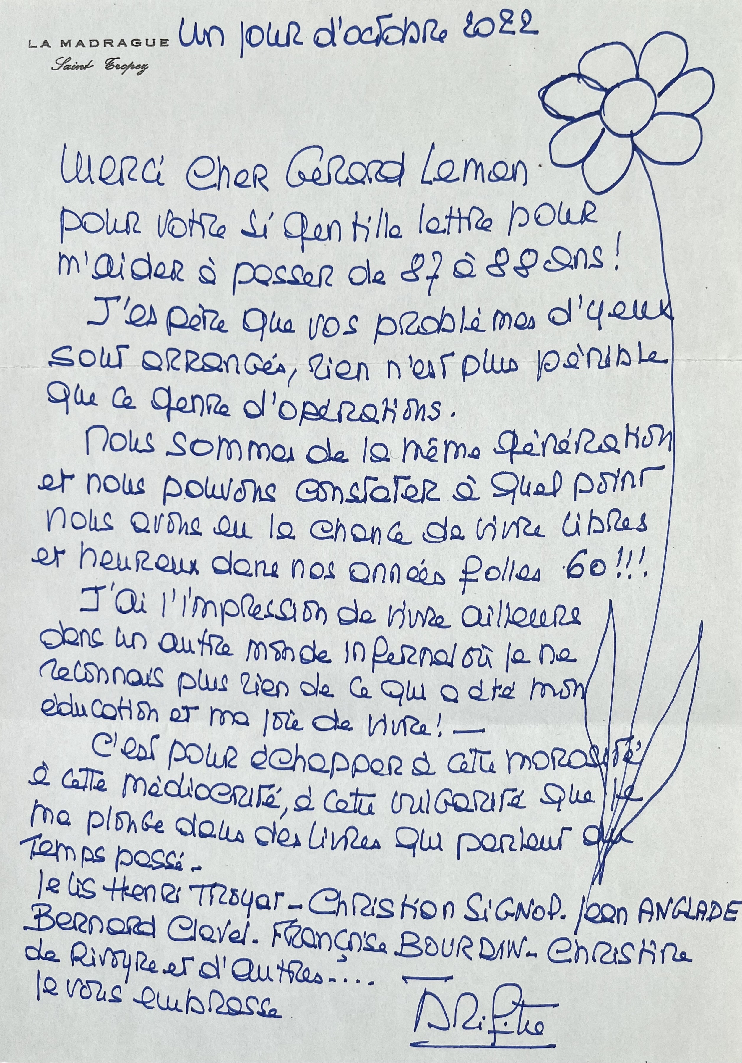 "Merci cher Gerard Leman pour votre si gentille lettre pour m'aider à passer de 87 à 88 ans. J'espère que vos problèmes d'yeux sont arrangés, rien n'est plus pénible que ce genre d'opérations. Nous sommes de la même génération et nous pouvons constater à quel point nous avons eu la chance de vivre libre et heureux dans nos années folles 60 !!! J'ai l'impression de vivre ailleurs dans un autre monde infernal où je ne reconnais plus rien de ce qui a été mon éducation et ma joie de vivre ! - C'est pour échapper à cette morosité, à cette médiocrité, à cette vulgarité que je me plonge dans des livres qui parlent du temps passé. Je lis Henri Troyat - Christian Signol - Jean Anglade - Bernard Clavel - Françoise Bourdin - Christine de Rivoyre et d'autres.... Je vous embrasse. Brigitte".