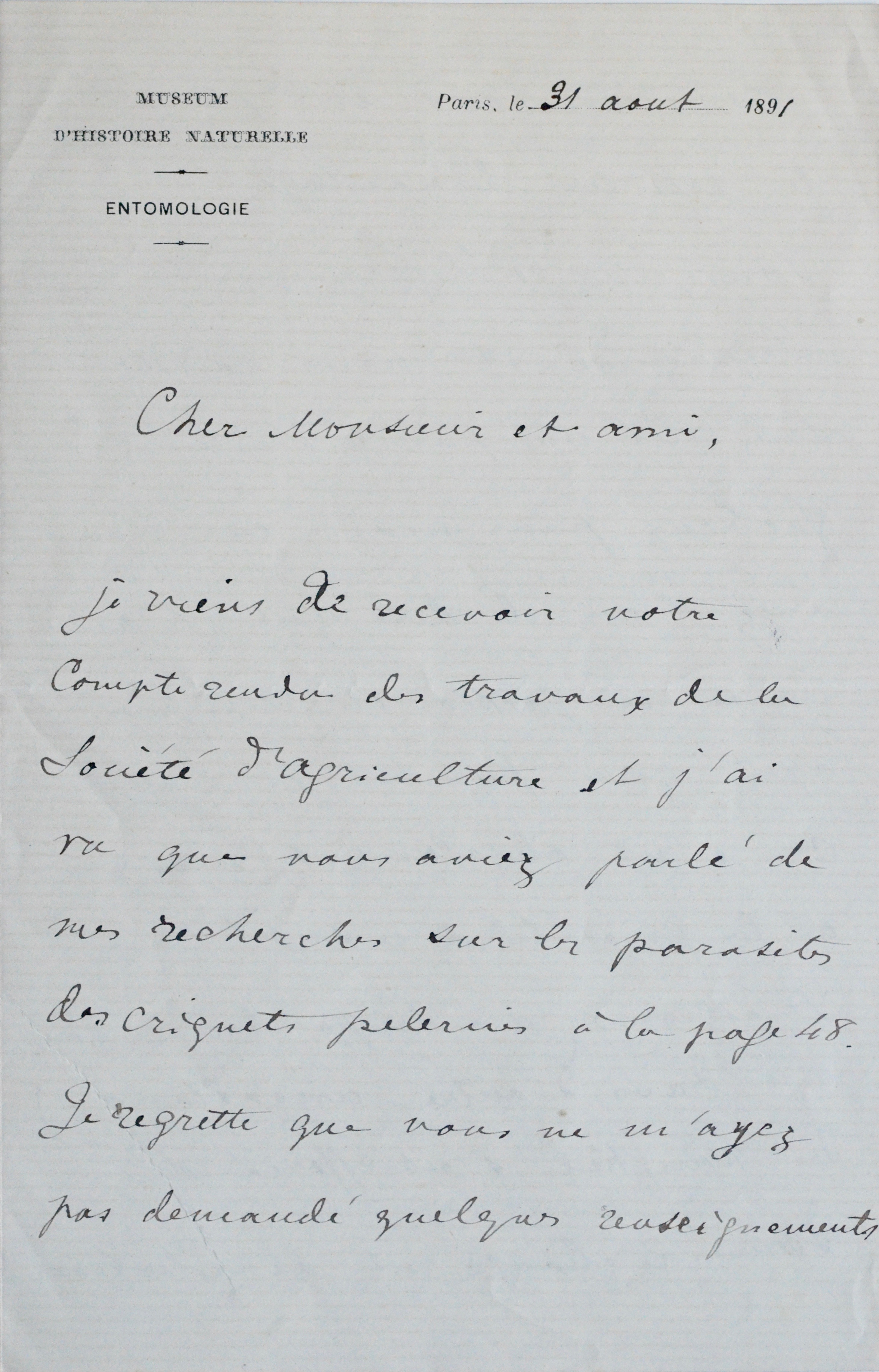 "Je viens de recevoir votre compte rendu des travaux de la Société d'Agriculture et j'ai vu que vous aviez parlé de mes recherches sur les parasites des criquets pèlerins à la page 48. Je regrette que vous ne m'ayez pas demandé quelques renseignements car cela vous eut permis de préciser davantage.