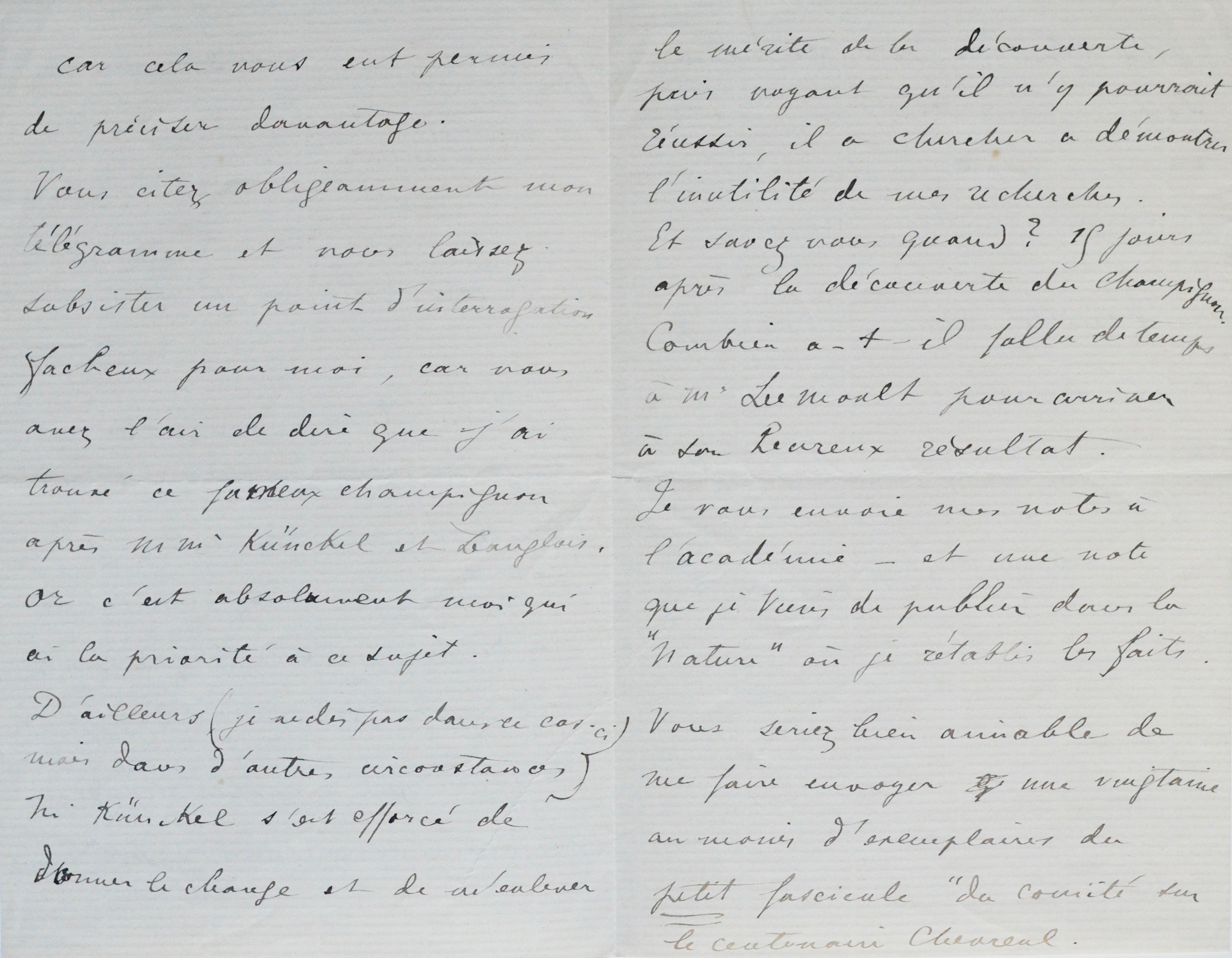 Vous citez obligeamment mon télégramme et vous laissez substituer un point d'interrogation fâcheux pour moi, car vous avez l'air de dire que j'ai trouvé ce fameux champignon après MM Künckel et Langlois. Or c'est absolument moi qui ai la priorité à ce sujet [...]". Il insiste : il a découvert le champignon parasite avant tout le monde. Il fait parvenir ses notes à l'Académie et réclame des fascicules "du comité sur le centenaire Chevreul".