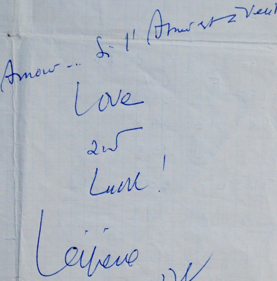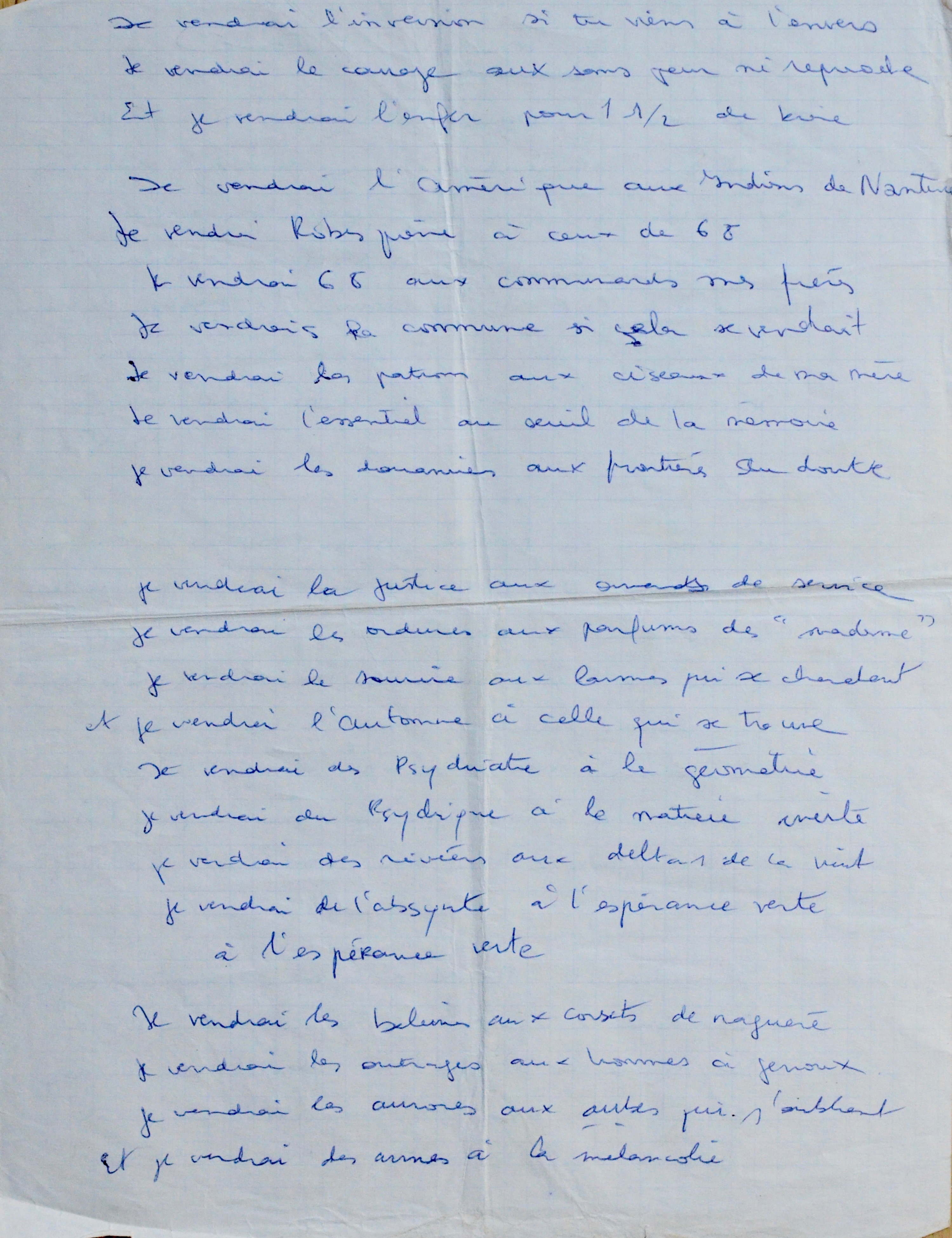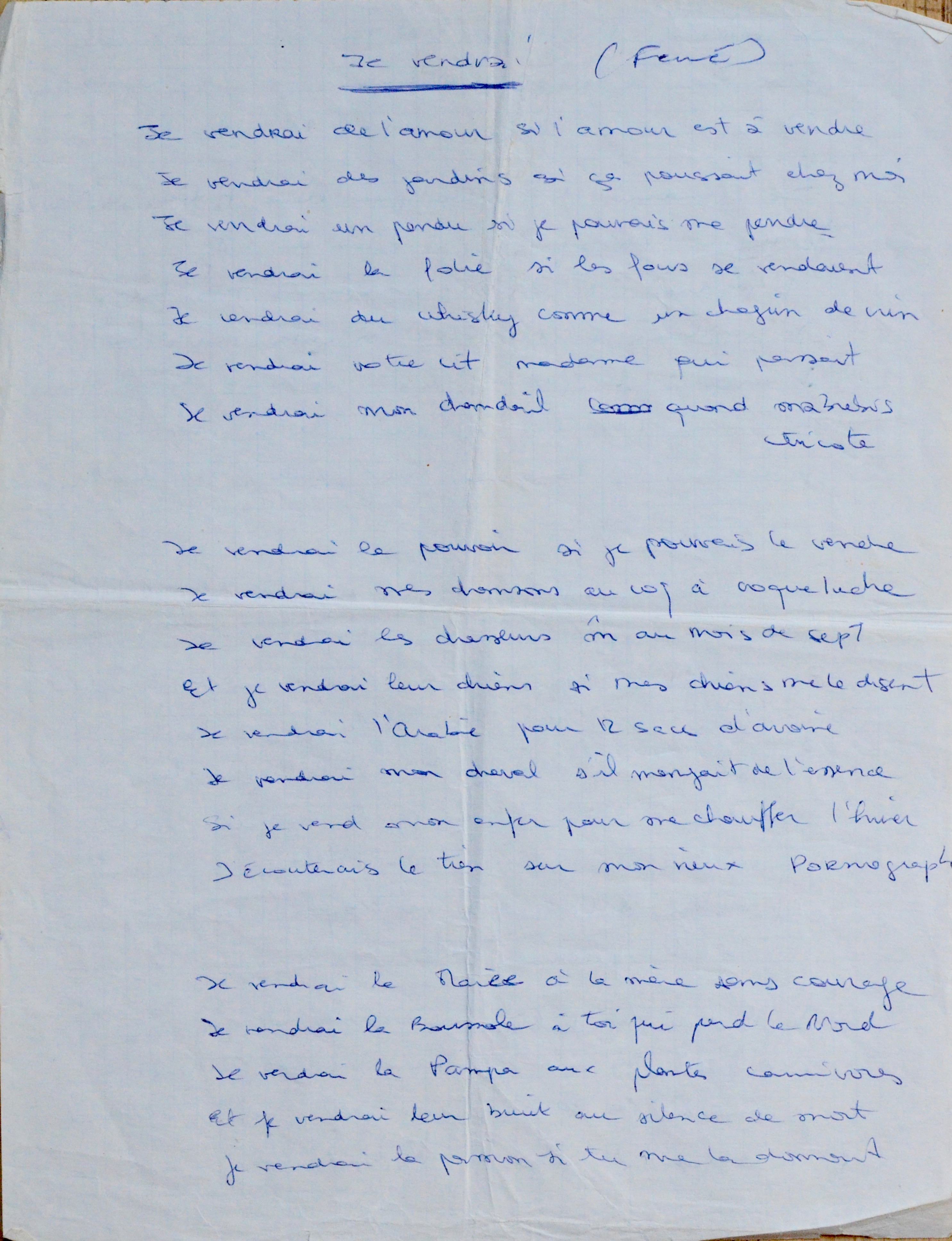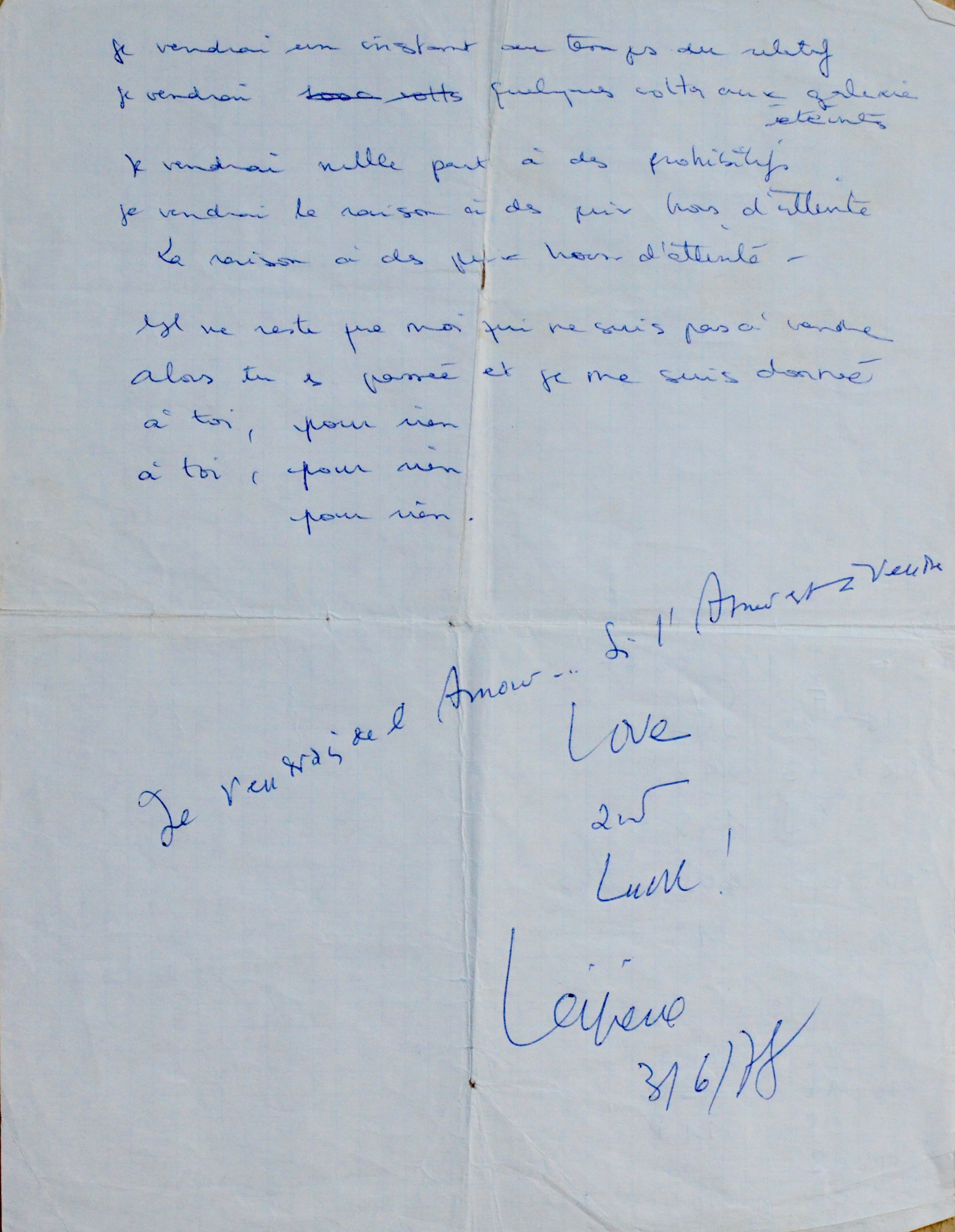 Léo Ferré (Monaco, 1916/1993)Copie manuscrite (non autographe) de la chanson de Léo Ferré « Je vendrais » [le véritable titre est en fait "À vendre", et fait partie de l'album La Frime (1977)], apostillée en fin par le chanteur, qui a répété le premier vers : "Je vendrais de l'Amour... si l'Amour est à vendre", puis signé et daté : "Love & Luck! Léo Ferré 3/6/78".