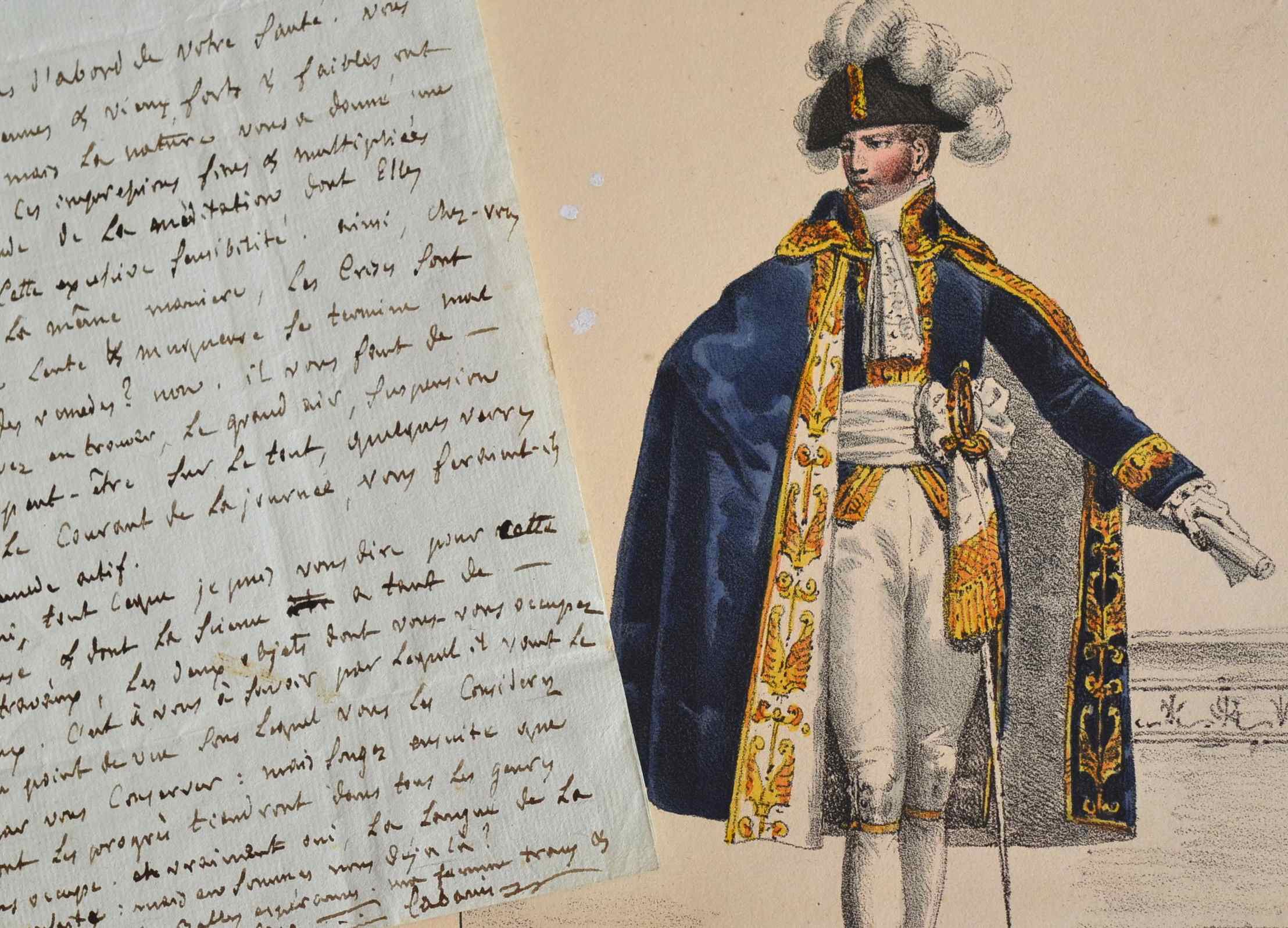 Dans cette belle lettre, Cabanis livre son diagnostic et ses prescriptions au philosophe Pierre Maine de Biran : «Vous avez le même cathare [sic] que jeunes et vieux, forts et faibles ont eu cet hiver dans presque toute l'Europe. Mais la nature vous a donné une organisation mobile et délicate, principe de ces impressions fines et multipliées qui brillent dans vos ouvrages : et l'habitude de la méditation dont elles vous sont un besoin, ajoute encore à cette excessive sensibilité. Ainsi, chez vous comme chez toutes les personnes organisées de la même manière, les crises sont tumultueuses et incomplètes : toute maladie lente des muqueuses se termine mal en pareil cas. Que vous faut-il ? Des remèdes ? Non. Il vous faut de l'exercice, de la distraction, si vous pouvez en trouver, le grand air, suspension de tout grand travail de la tête.» On perçoit ici les idées de Cabanis qui mêlent la physiologie et la psychologie. Il encourage également son «excellent ami» à poursuivre ses recherches philosophiques : « Les deux objets dont vous vous occupez sont également intéressants à mes yeux.» On joint : une lithographie en couleurs de Delpech représentant Cabanis en Sénateur.
