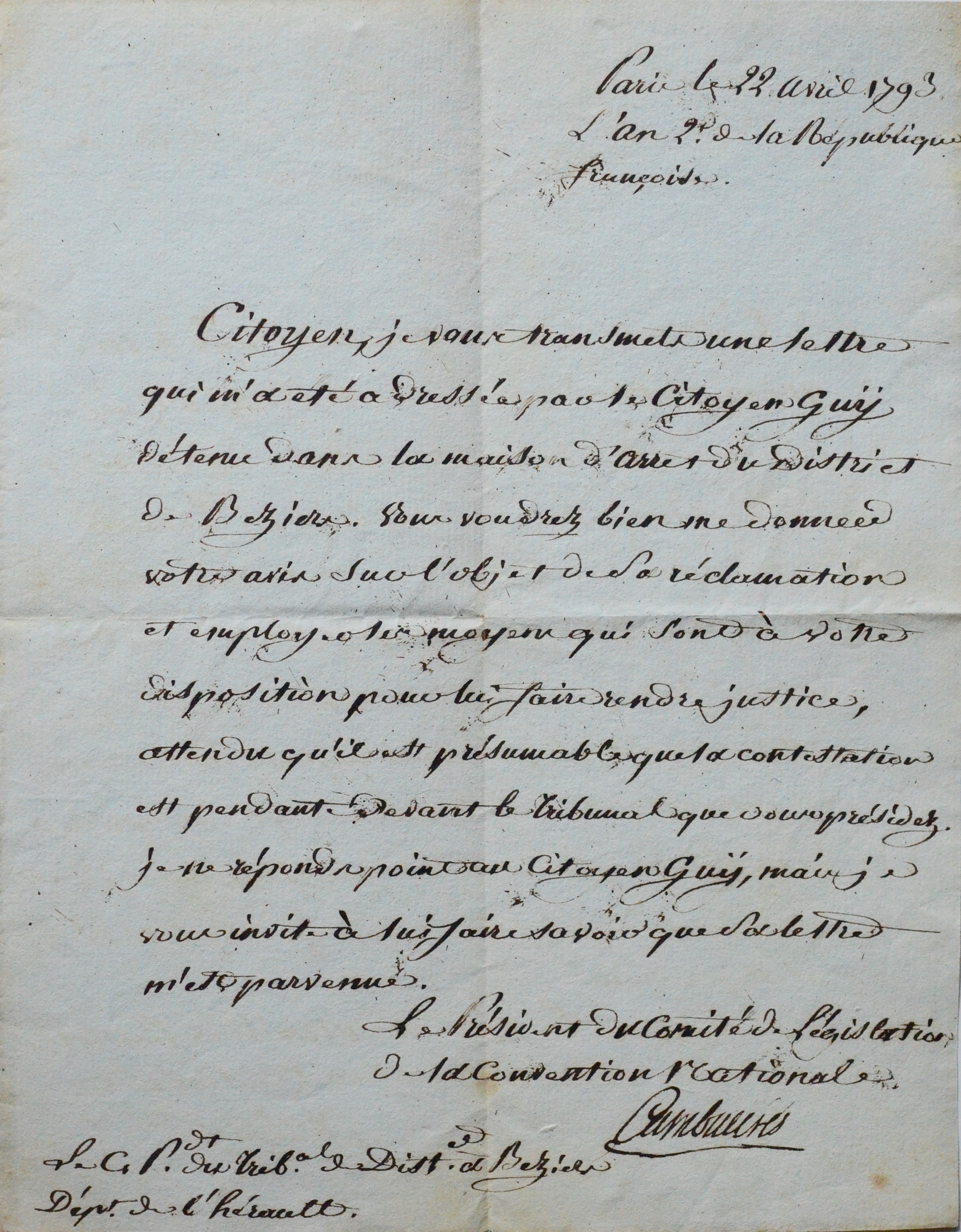 Cambacérès fait parvenir au président du Tribunal de Béziers la lettre du citoyen Guy, détenu dans la maison d'arrêt de cette même ville. "Vous voudrez bien me donner votre avis sur l'objet de sa réclamation et employer les moyens qui sont à votre disposition pour lui faire rendre justice, attendu qu'il est présumable que sa consultation est pendant devant le tribunal que vous présidez [...]". Il ne répondra pas au citoyen Guy mais engage son correspondant à prévenir le détenu que sa lettre est bien arrivée.