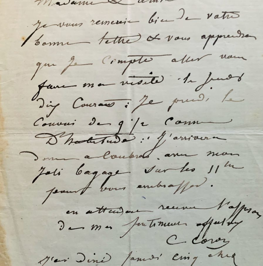 "Je vous remercie bien de votre bonne lettre & vous apprendrez que je compte aller vous faire ma visite le jeudi 10 courant : je prends le convoi de 9 1/2 comme d'habitude : j'arriverai donc à Coubron avec mon joli bagage sur les 11h pour vous embrasser". Il ajoute en P.S. "J'ai dîné samedi cinq chez Mr Herman avec vos enfants. On comptait un peu sur vous".