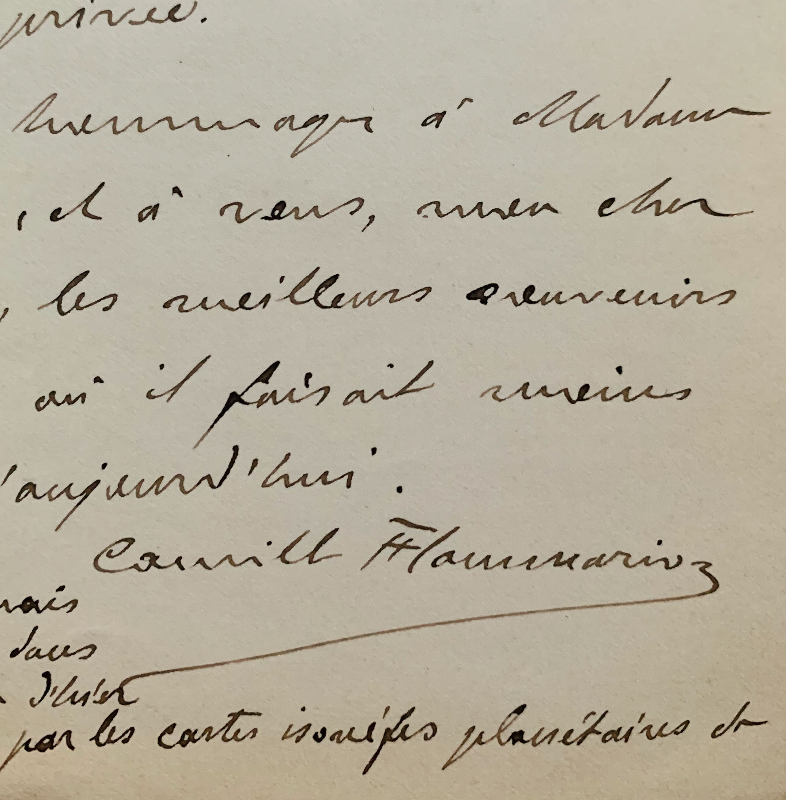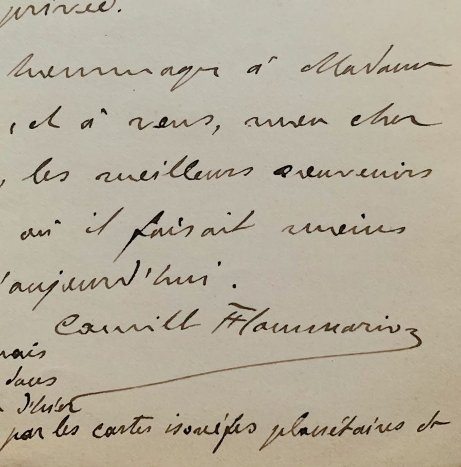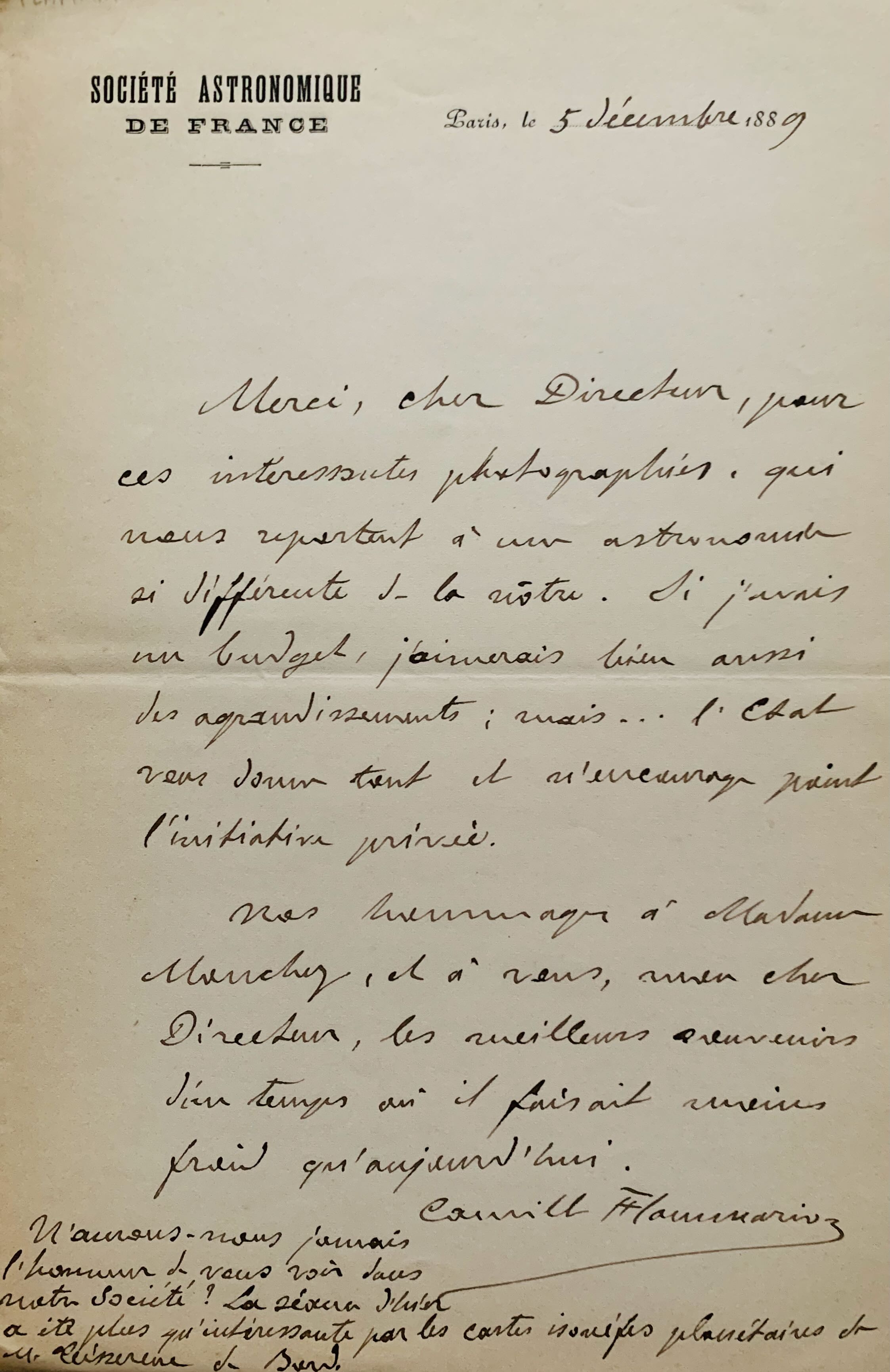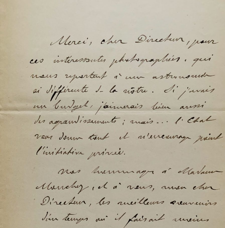 Camille Flammarion remercie Mouchez pour "ces intéressantes photographies qui nous reportent à une astronomie si différente de la nôtre. Si j'avais un budget, j'aimerais bien aussi des agrandissements, mais... l'État vous donne tant et n'encourage point l'initiative privée [...]. N'aurons-nous jamais l'honneur de vous voir dans notre Société? La séance d'hier a été plus qu'intéressante par les cartes planétaires de M. Teisserenc de Bort" [Léon Teissorenc de Bort (1855-1913) qui donna son nom à des cratères sur mars et sur la lune].