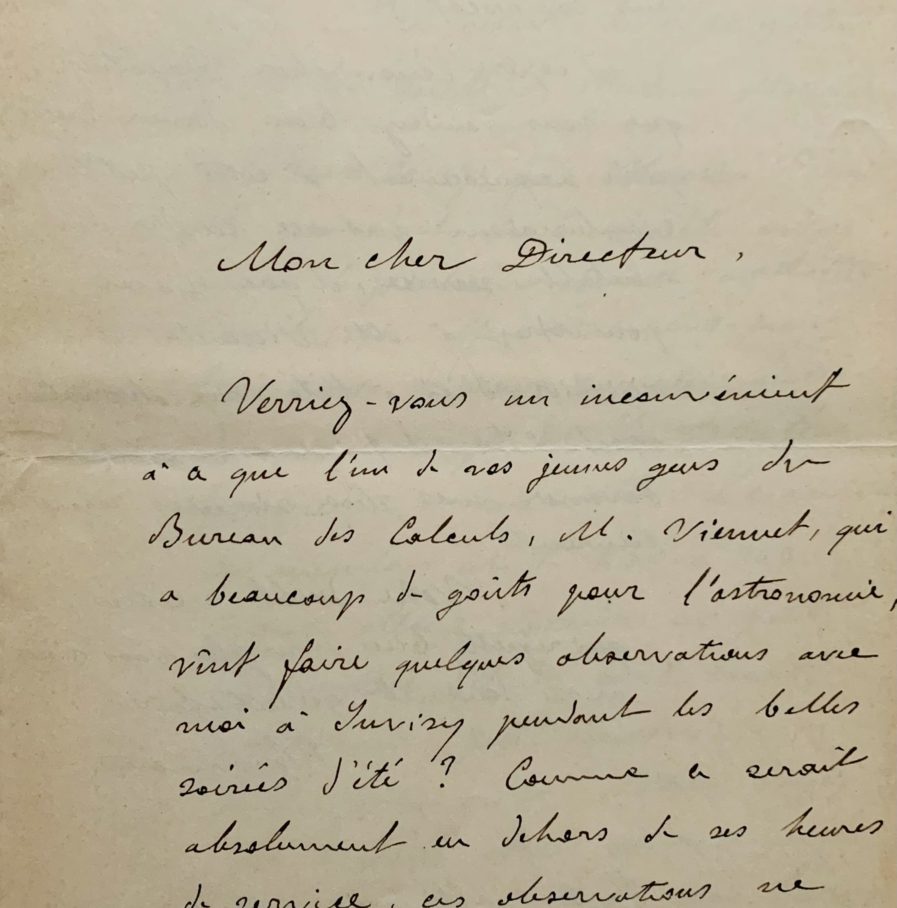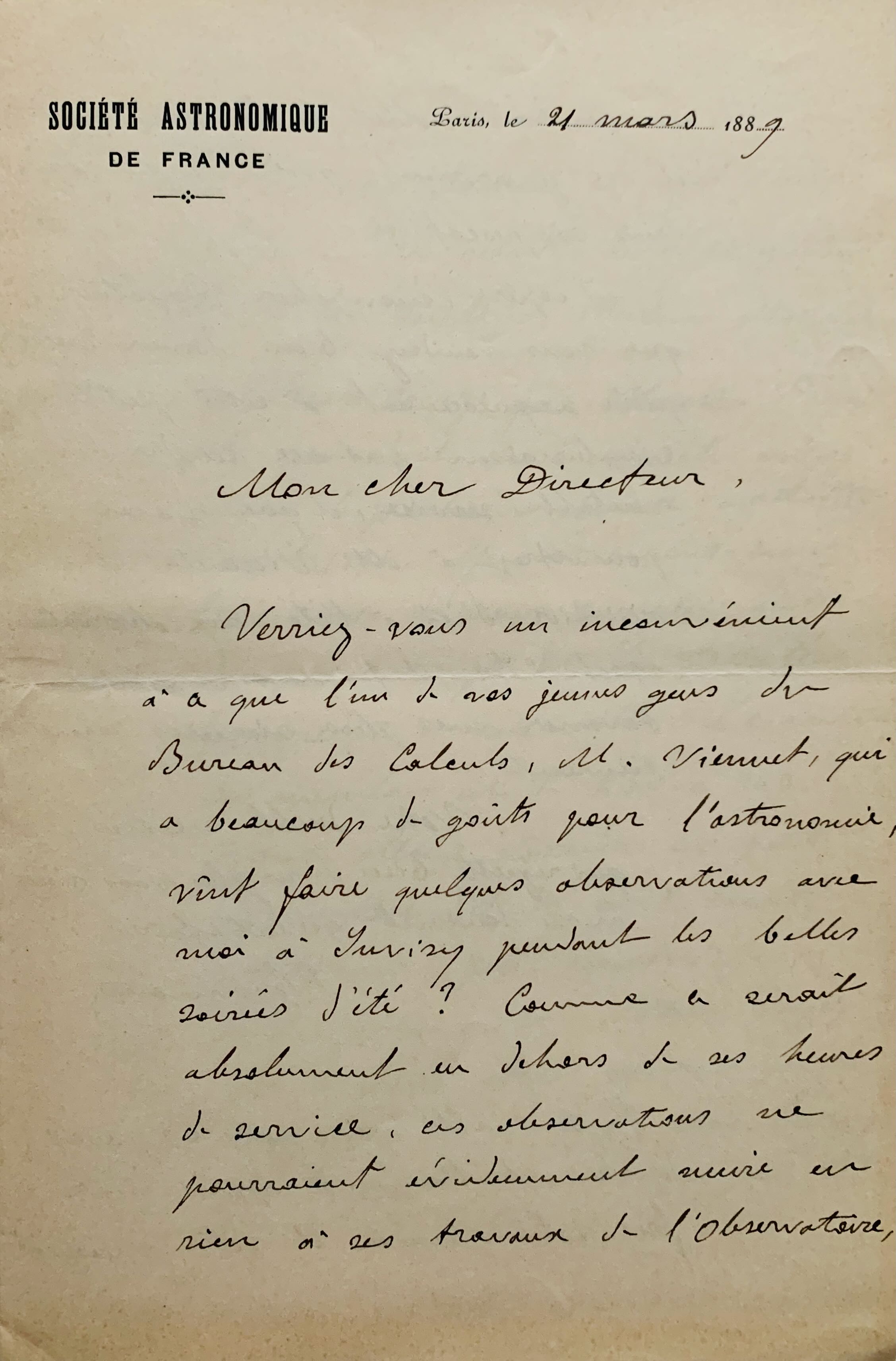 Il désirerait qu'un des "jeunes gens du Bureau des calculs" vienne le seconder à Juvisy "pendant les belles soirées d'été". "Comme ce serait absolument en dehors de ses heures de service, ces observations ne pourraient évidemment nuire en rien à ses travaux de l'Observatoire [...]". Il regrette de ne plus voir Mouchez aussi souvent qu'autrefois et lui donne des nouvelles de la Société Astronomique de France. "Vous savez que monsieur Faye [l'astronome Hervé Faye (1814-1902)] est président de la Société astron. pour le prochain exercice avril 1889 - avril 1890. Quand aurons-nous l'honneur de vous compter aussi dans nos rangs? La Société progresse à merveille. Le nombre des membres est de 230 à 240. Nous allons posséder un petit observatoire d'études avec lunette méridienne, petit équatorial, bibliothèque, etc. Vous voyez que le fruit était mûr et que si vous aviez eu le temps vous auriez pu la fonder même un peu plus tôt".