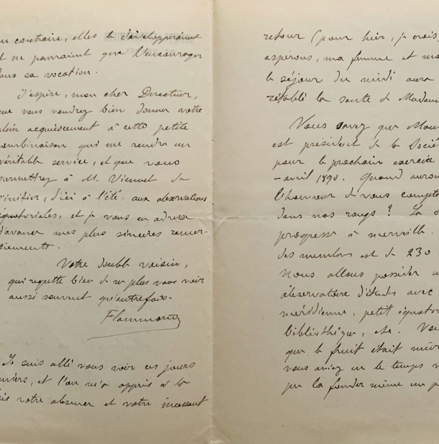 Camille Flammarion (Montigny-le-Roi (Haute-Marne)., 1842/1925)Belle lettre de Camille Flammarion à Ernest Mouchez, évoquant le succès de la toute jeune Société Astronomique de France qu'il avait fondée deux ans plus tôt.