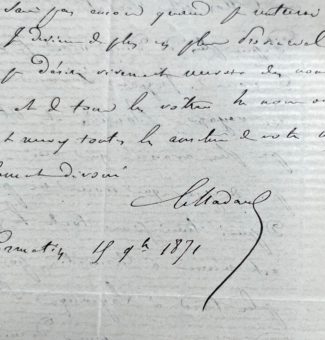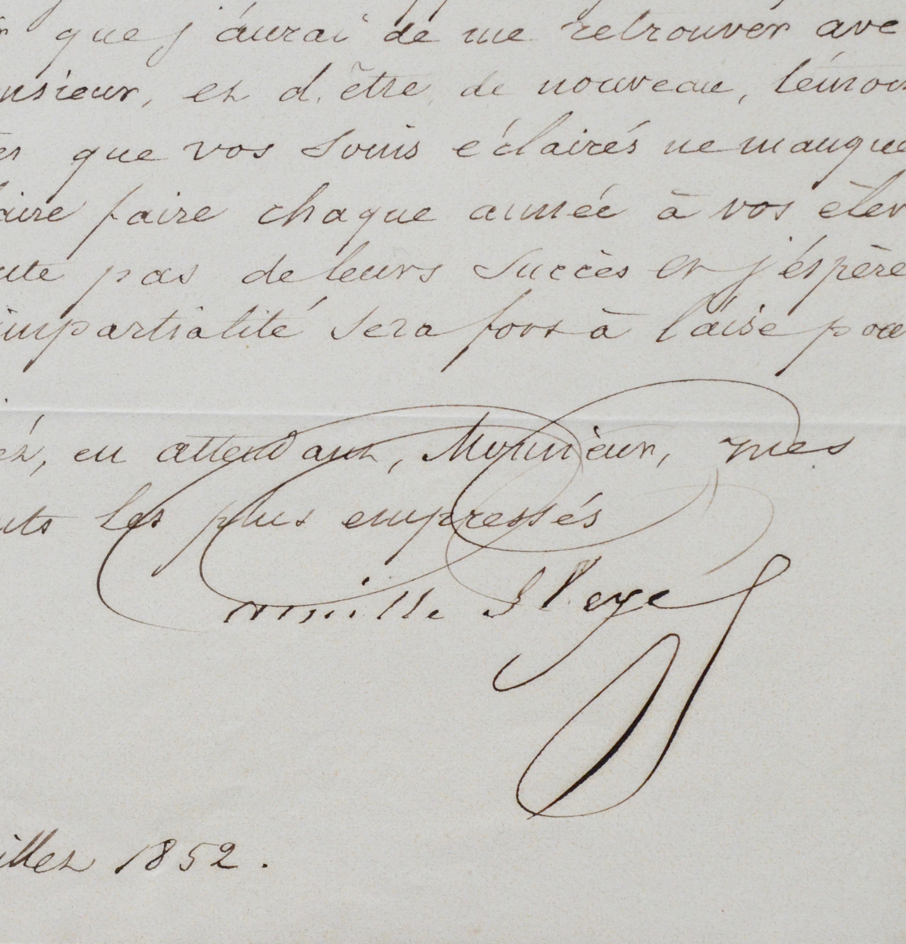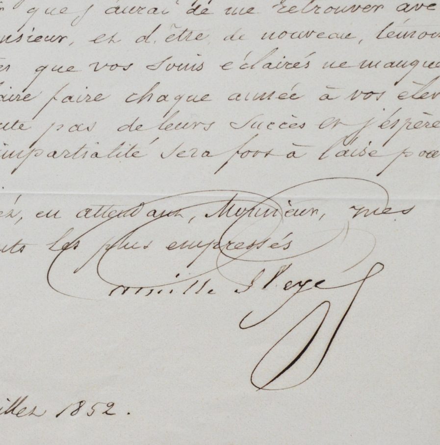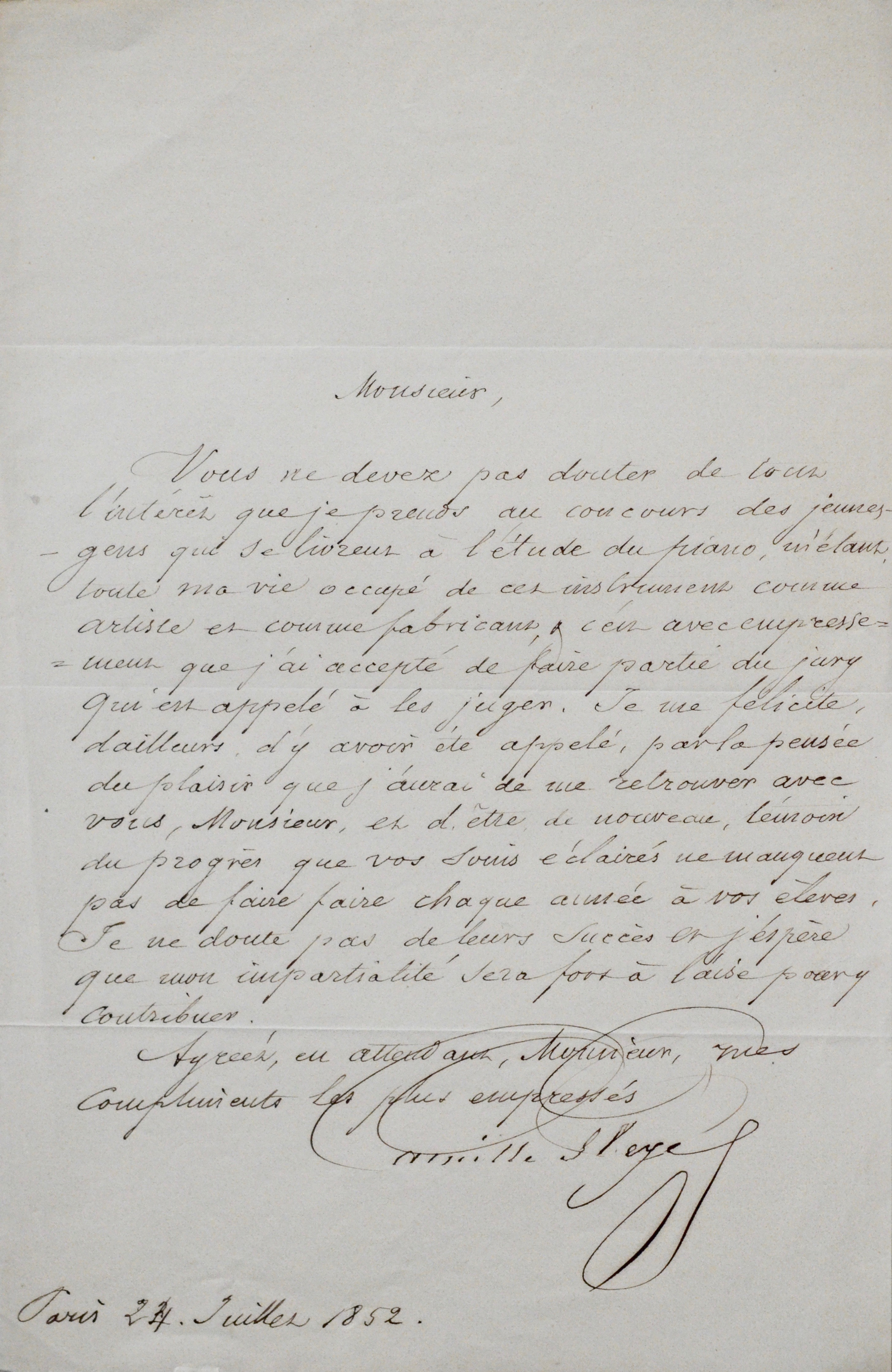 "Vous ne devez pas douter de tout l'intérêt que je prends au concours des jeunes-gens qui se livrent à l'étude du piano, m'étant toute ma vie occupé de cet instrument comme artiste et comme fabriquant & c'est avec empressement que j'ai accepté de faire partie du jury qui est appelé à les juger. Je me félicite, d'ailleurs, d'y avoir été appelé, par la pensée du plaisir que j'aurais de me retrouver avec vous, Monsieur, et d'être de nouveau témoin du progrès que vos soins éclairés ne manquent pas de faire faire chaque année à vos élèves [...]".