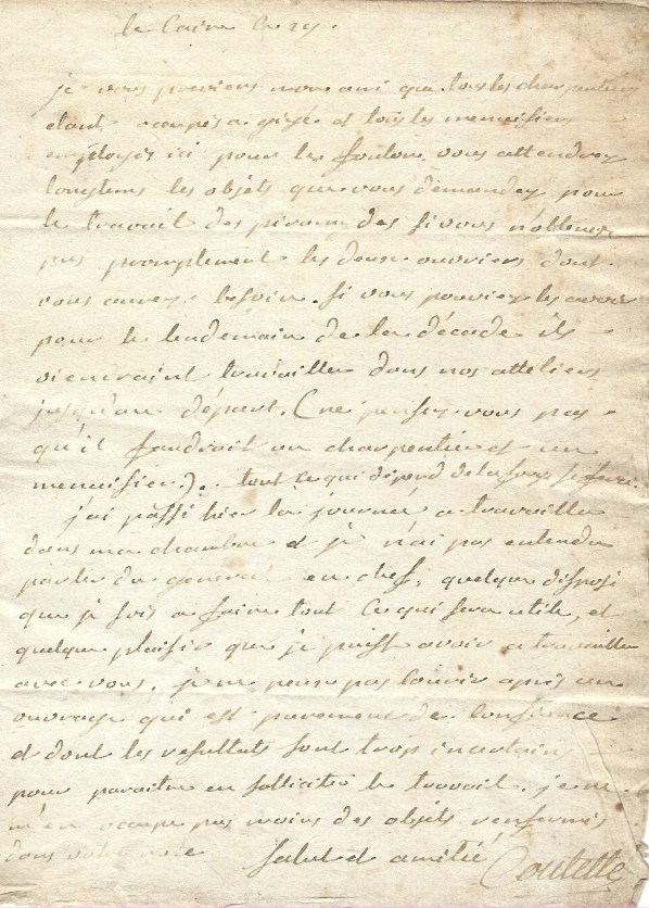 Lettre de Jean-Marie Coutelle, commandant les aérostiers. "Je vous préviens mon ami que tous les charpentiers étant occupés à Gizé et tous les menuisiers employés ici par les foulons, vous attendrez longtemps les objets que vous demandez pour le travail des pyramides si vous n'obtenez pas promptement les deux ouvriers dont vous auriez besoin. Si vous pouviez les avoir pour le lendemain de la décade, ils viendraient travailler dans nos atteliers jusqu'au départ [...]. J'ai passé hier la journée à travailler dans ma chambre et je n'ai pas entendu parler du général en chef. Quelque disposé que je sois à faire tout ce qui sera utile, et quelque plaisir que je puisse avoir à travailler avec vous, je ne pense pas courir après un ouvrage qui est purement de confiance et dont les résultats sont trop incertains pour paraître en solliciter le travail [...]".