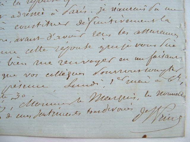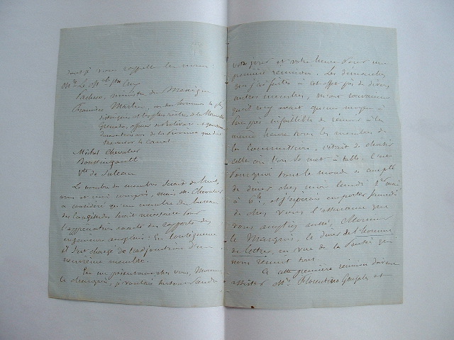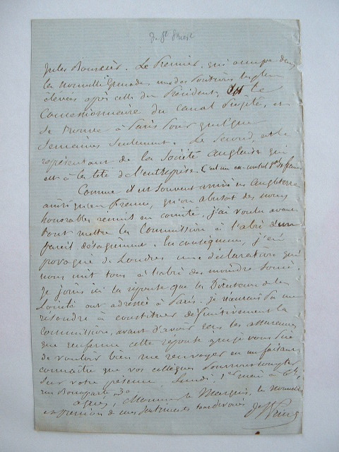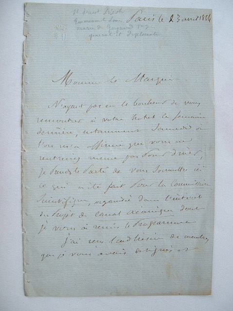 Emmanuel Louis Marie Saint-Priest (Guignard, vicomte de) (Paris, 1779/1881)Naissance d'un des tout premiers projets du futur canal de Panama. «Je prends le parti de vous soumettre ici ce qui a été fait pour la commission scientifique organisée dans l'intérêt du canal océanique dont je vous ai remis le programme. J'ai reçu les adhésions de membres que je vous avais désignés dont je vous rappelle les noms : M. le maréchal Santa-Cruz, Pachero ministre du Mexique, Francisco Martin un des hommes les plus distingués et les plus riches de la Nouvelle-Grenade, officier de Bolivar et gouverneur durant trois ans de la province que doit traverser le canal, Michel Chevalier, Boussingault, vicomte de Suleau. Le nombre des membres serait de huit, vous et moi compris, mais M. Chevalier a considéré qu'un membre du bureau des longitudes serait nécessaire pour l'appréciation exacte des rapports des ingénieurs anglais : en conséquence, il s'est chargé de l'adjonction d'un neuvième membre». Ils conviennent d'une première réunion, à laquelle doivent assister deux personnalités éminentes de la Nouvelle-Grenade : le concessionnaire du canal projeté et le représentant de la société anglaise qui est à la tête de l'entreprise. Il explique les démarches engagées à Londres pour protéger le projet des appétits anglais.