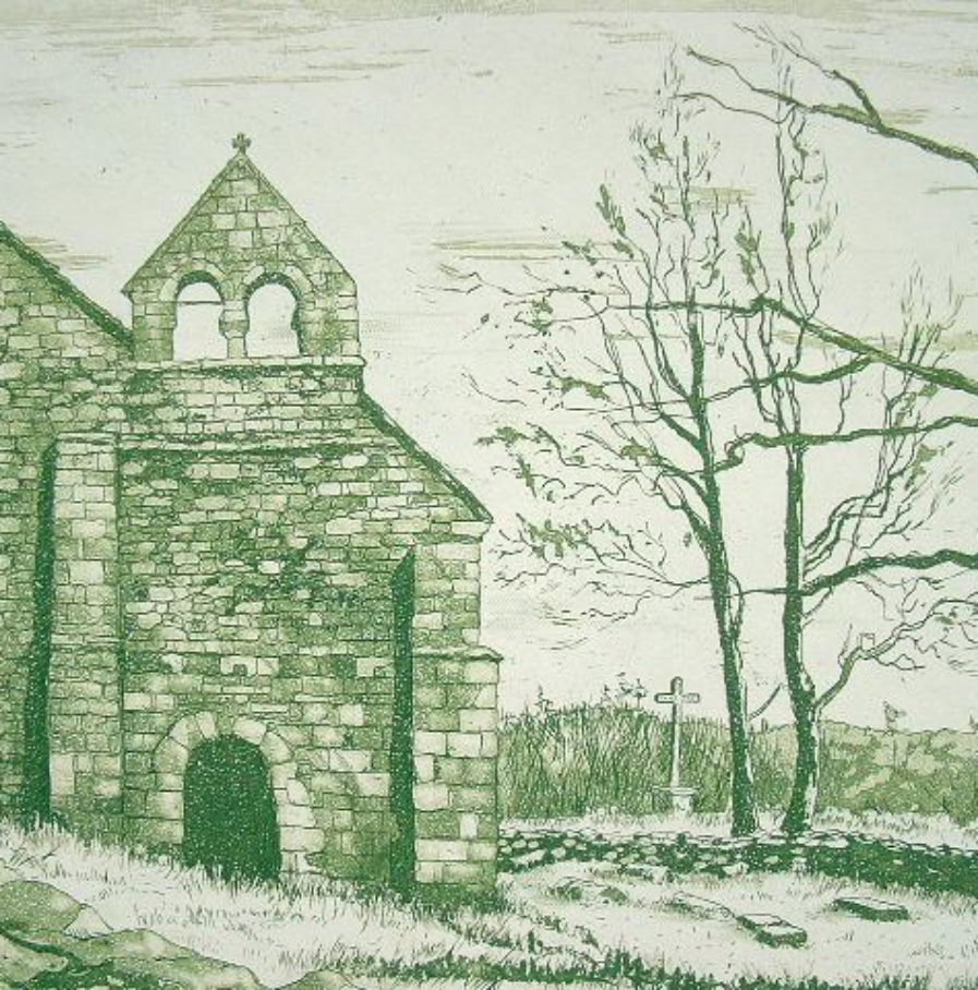 Eau-forte et aquatinte signée Pascale Moulier. Gravure représentant la petite chapelle du Roc Vignoret, sur la commune d'Antignac, dans le Cantal.Epreuve numéro 15 (tirage limité à 30 exemplaires).