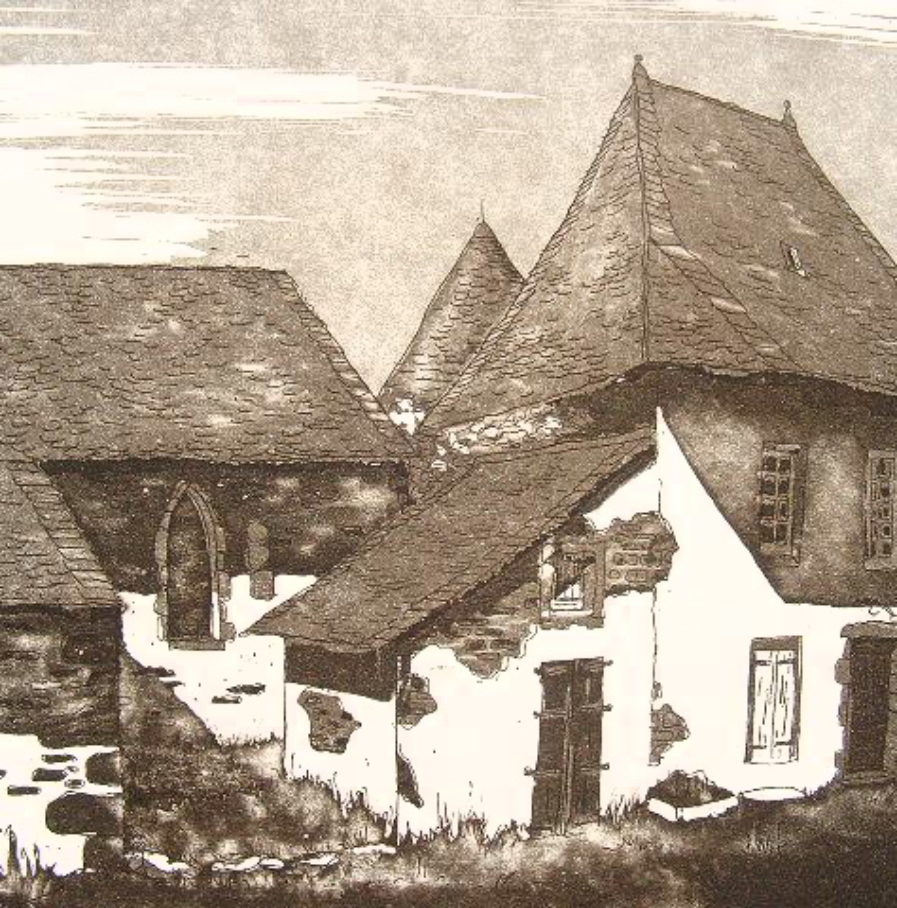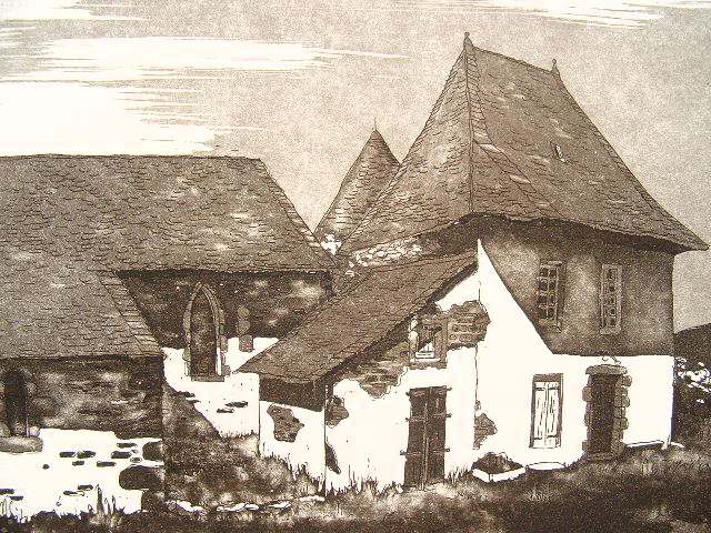 Eau-forte et aquatinte signée Pascale Moulier. Gravure représentant La Salvetat, à une quinzaine de kilomètres d'Aurillac, dans le Cantal.