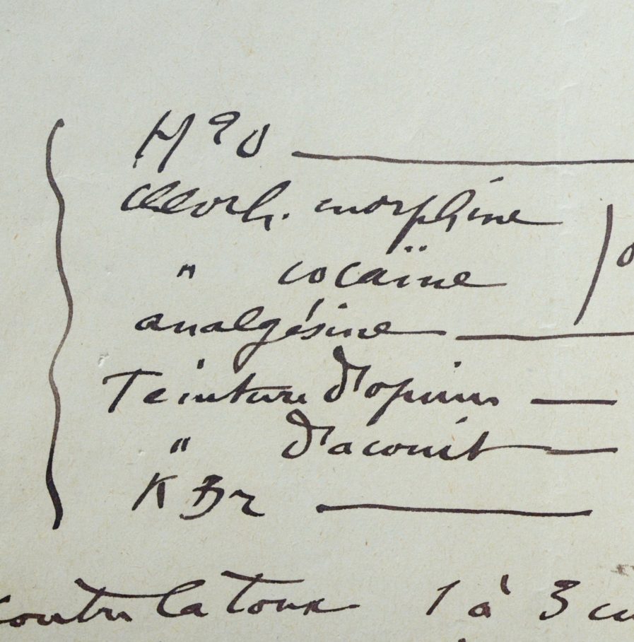 Il préconise un mélange d'eau, de morphine ou cocaïne (0,20 gr), d'analgésine (4 gr), de teinture d'opium (CL gttes), etc, avec la posologie "1 à 3 cuillères à café espacées, par nuit". Si cela ne suffit pas :un flacon d'"Oethone", 50 à 80 gouttes 2 à 3 fois par nuit.