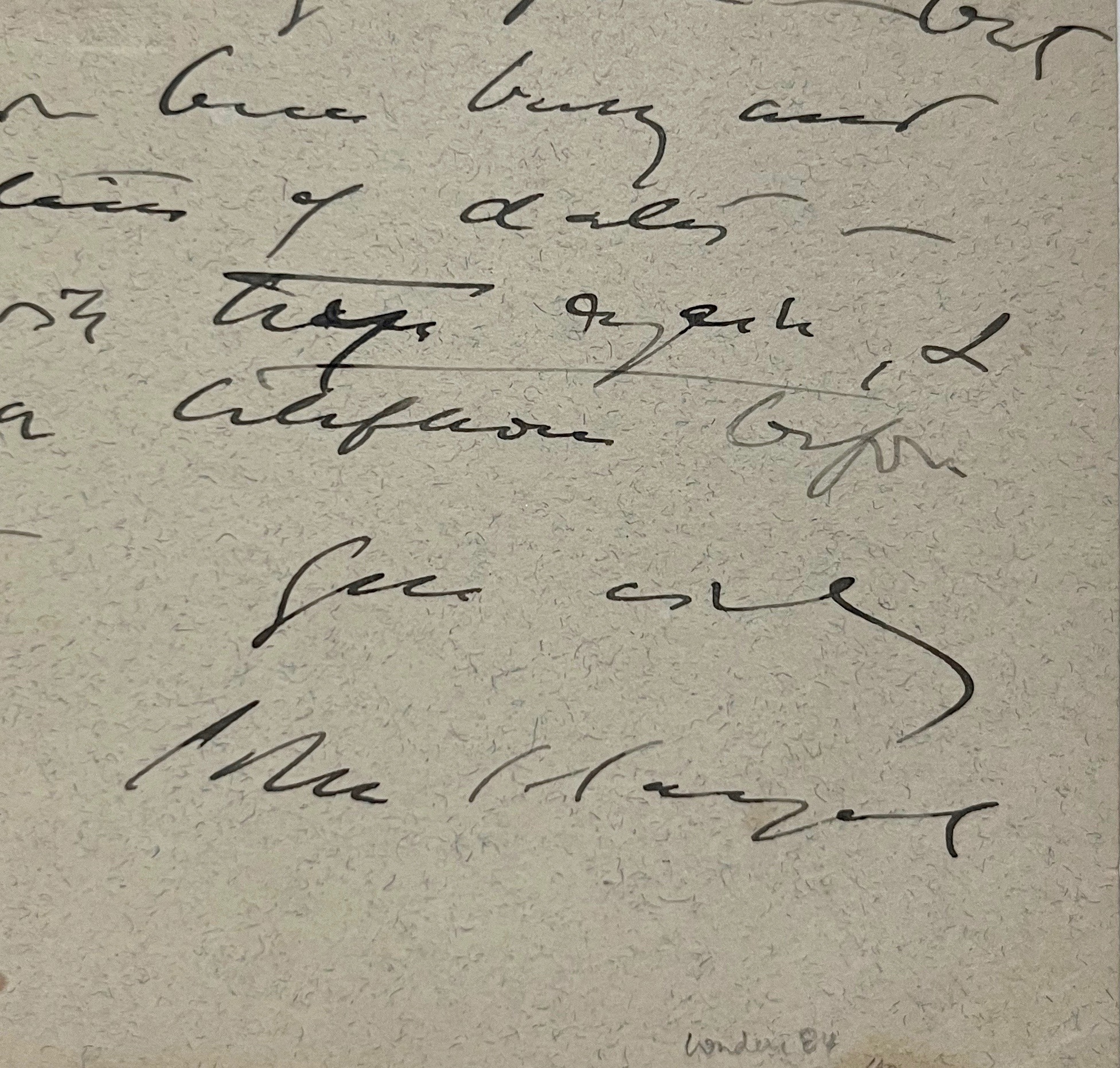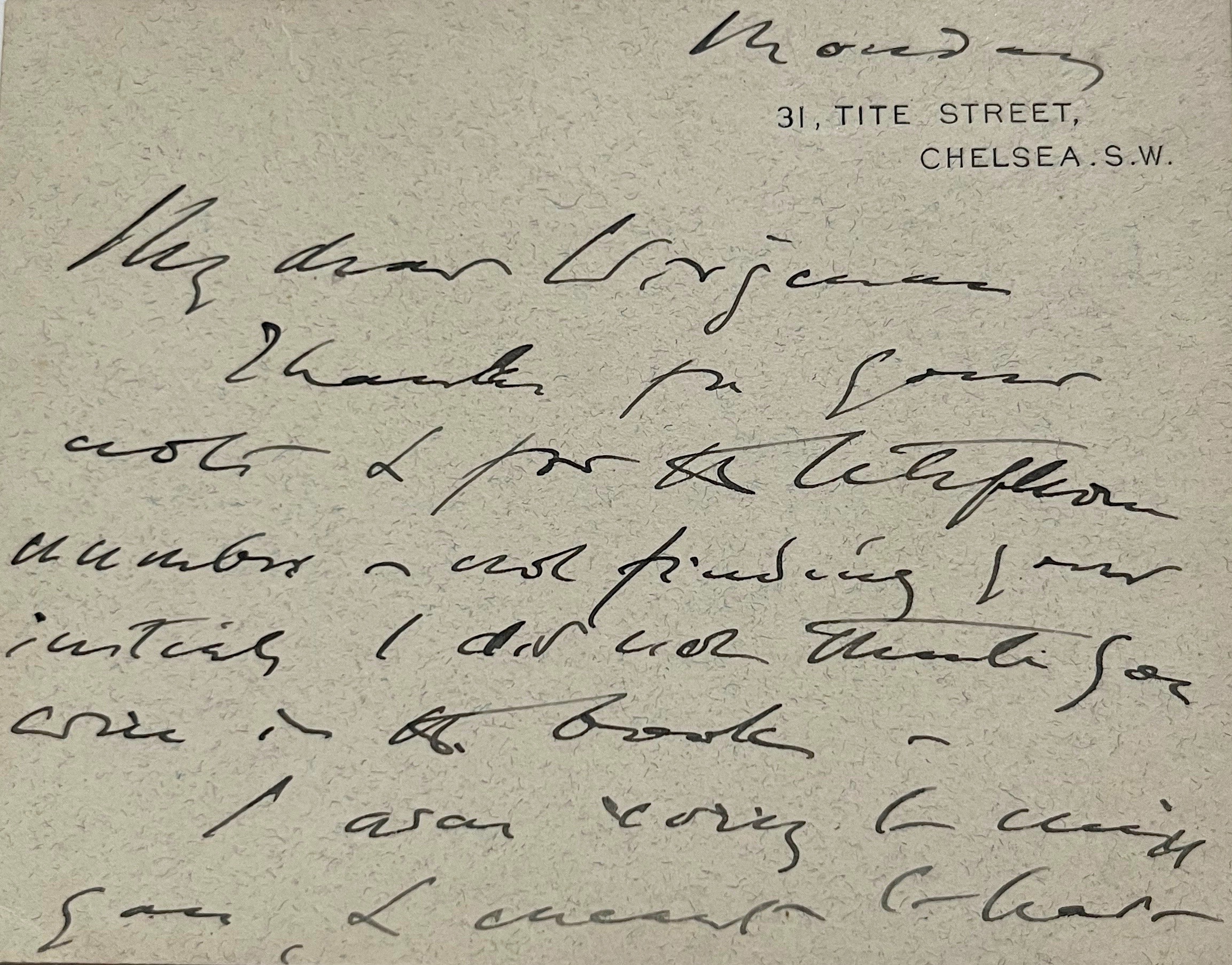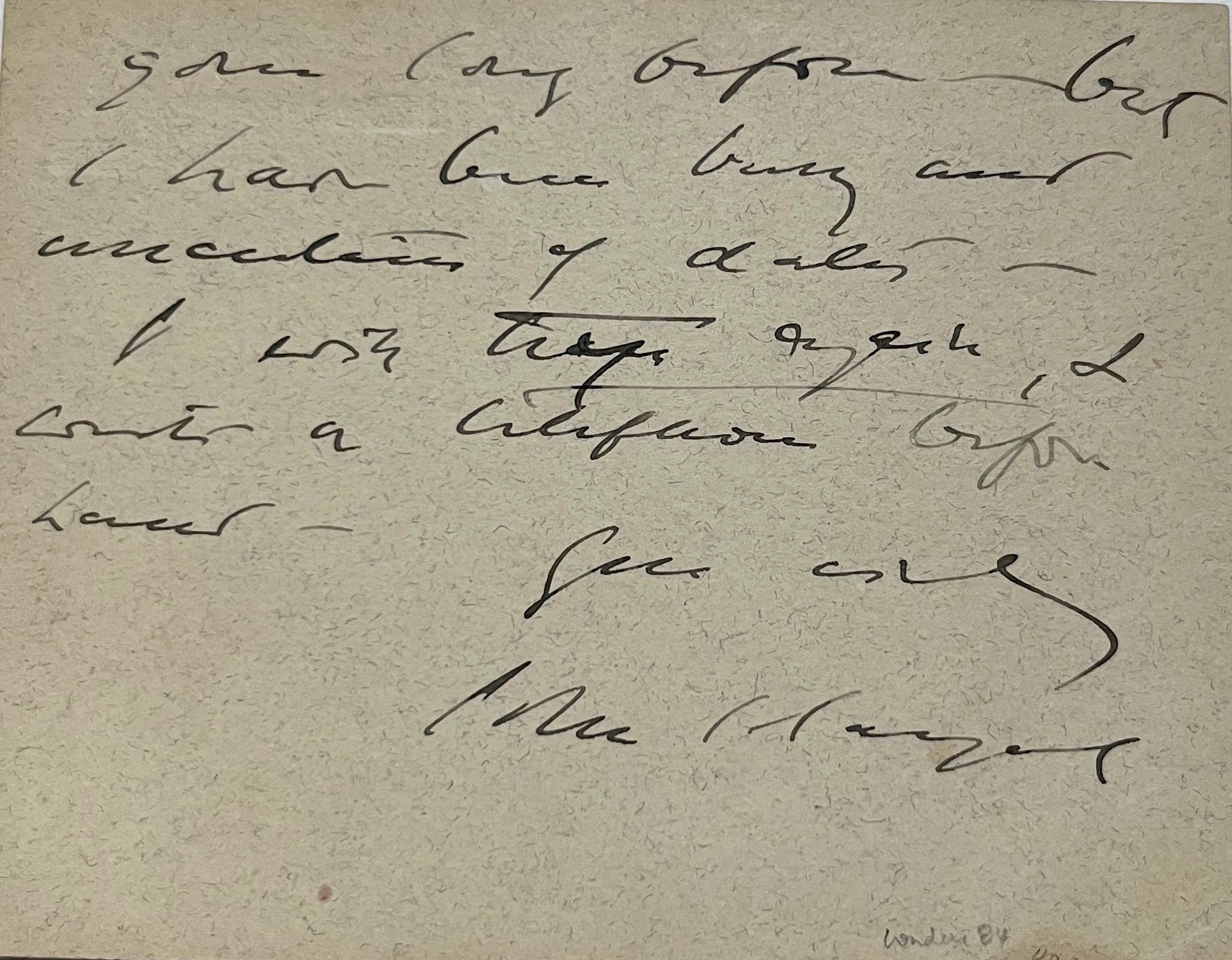 John Singer Sargent remercie sa correspondante de sa note - ne connaissant pas ses initiales, il n’avait pu la remercier dans le livre "in the book". Le peintre est désolé de la manquer, mais il a été très occupé et incertain quant aux dates... Il essaiera de passer, et promet de l’appeler bientôt au téléphone.