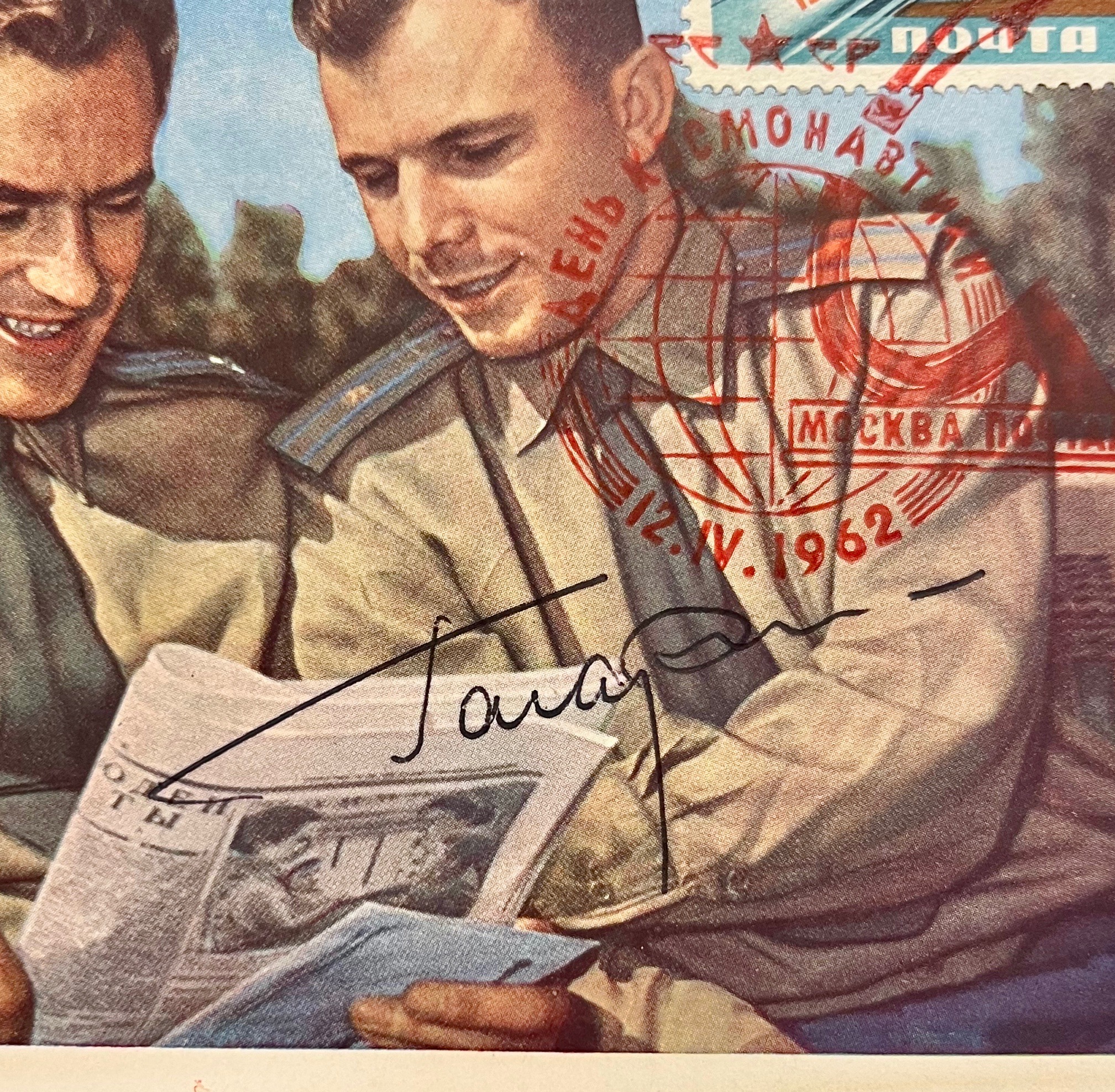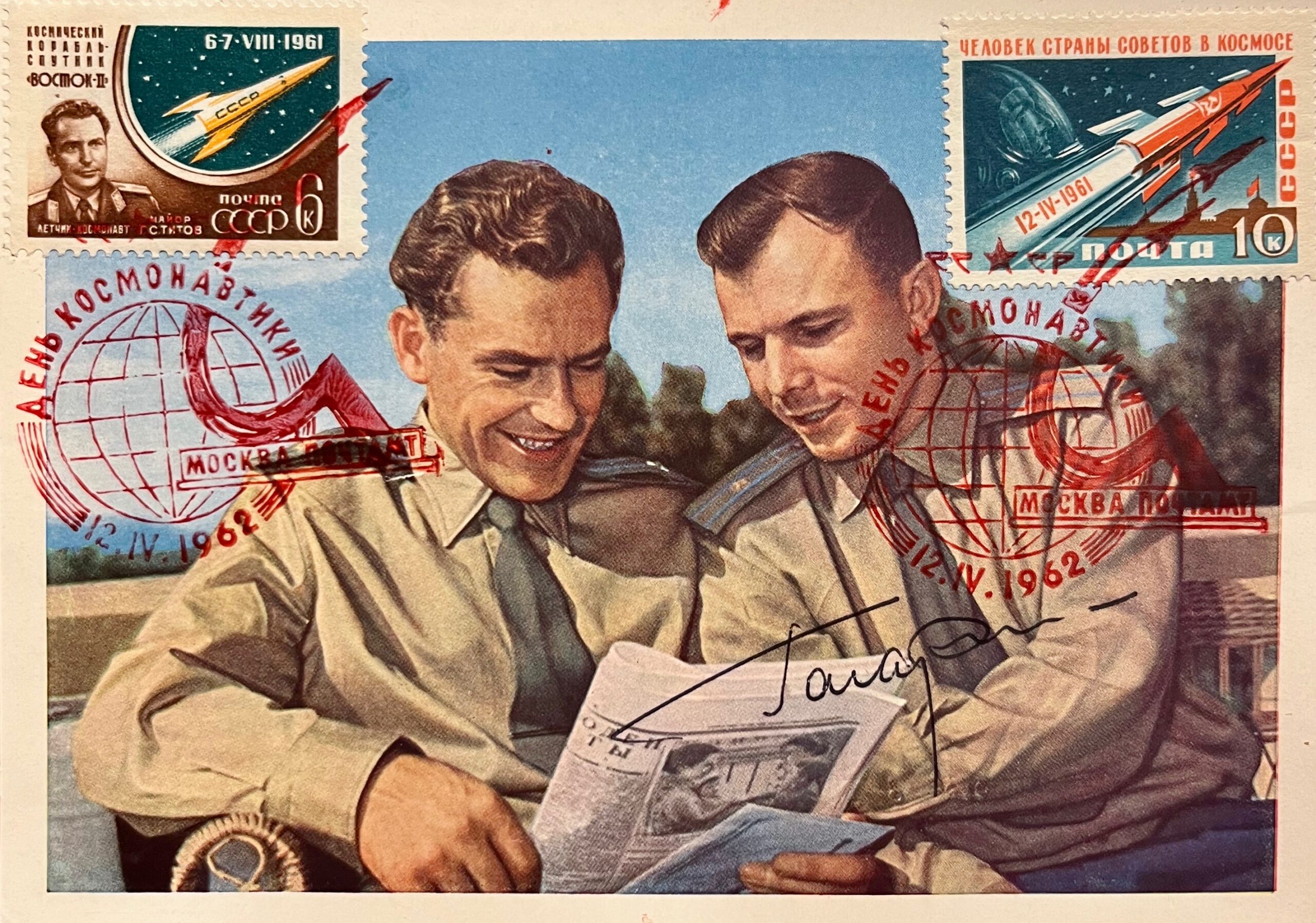 Carte éditée par les autorités soviétiques, le 12 avril 1962, à l'occasion du 1er anniversaire du 1er vol dans l'espace. Elle représente Youri Gagarine en compagnie de German Titov, lisant un journal.