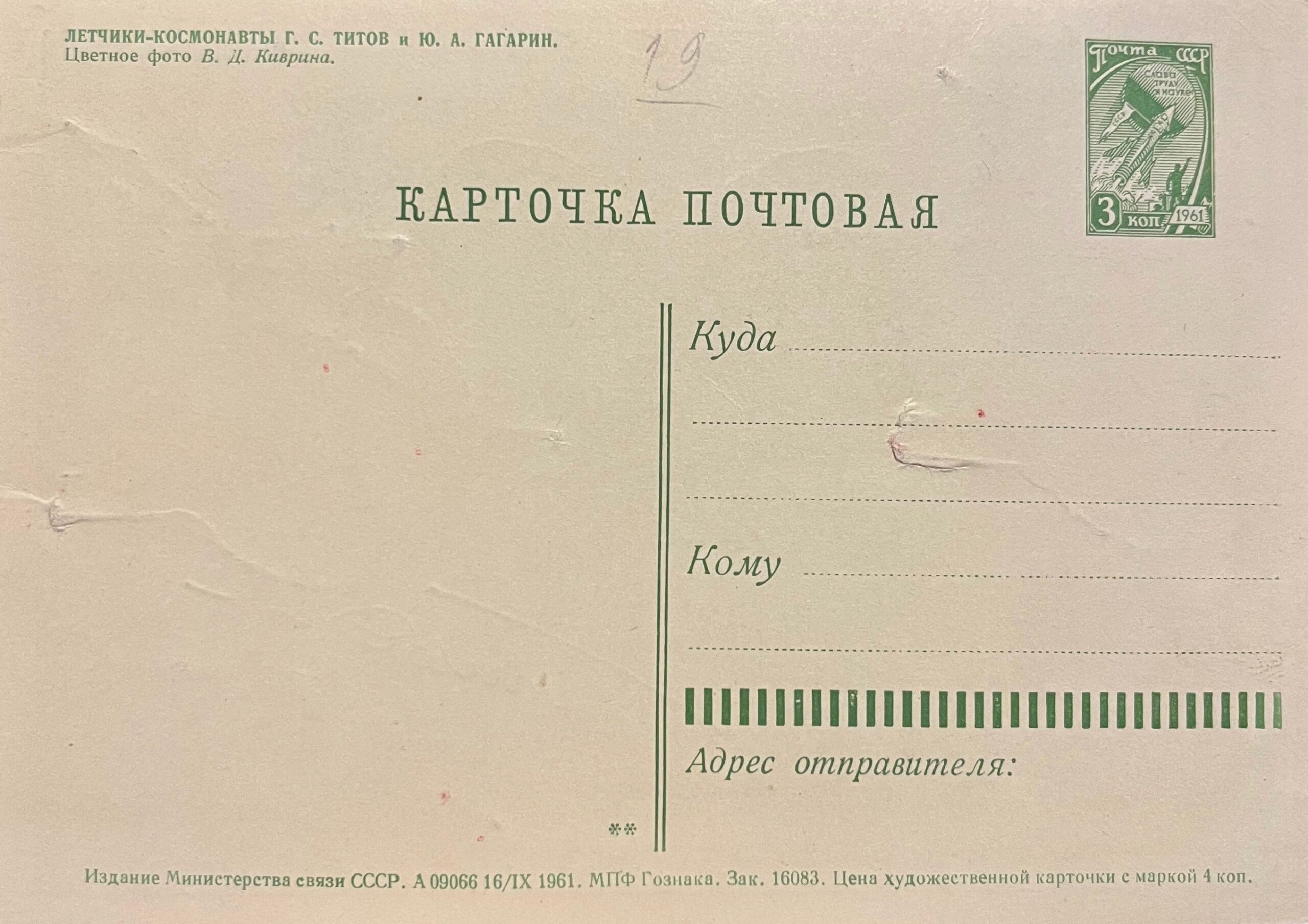 Elle est affranchie des deux timbres célébrant les deux premiers vols dans l'espace des 12 avril 1961 (Gagarine à bord de Vostok 1) et 6-7 août 1961 (German Titov à bord de Vostok 2), avec cachets postaux à l'encre rouge, à la date du 12 avril 1962.