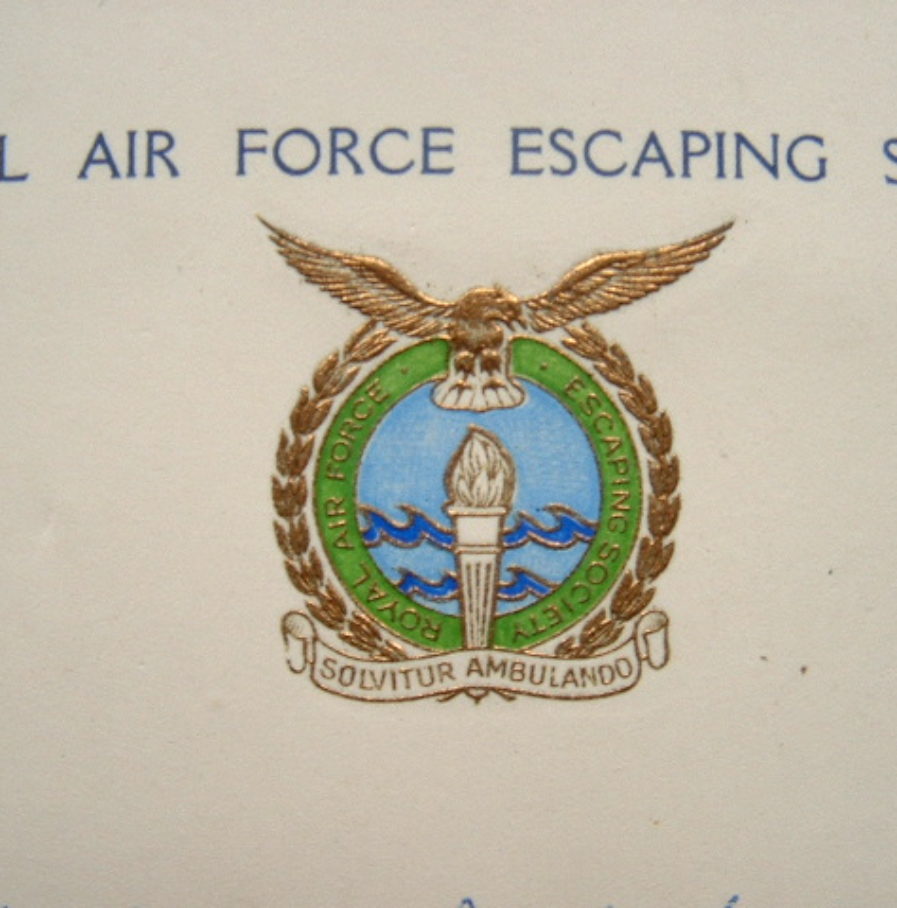 Jolie carte avec attributs dorés et en relief de la Royal Air Force Escaping Society. Attribuée à Mme André, membre d'honneur.