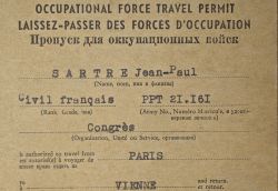 Laissez-passer des forces d'occupation accordé à Jean-Paul Sartre lors du Congrès mondial des peuples pour la paix à Vienne de 1952, où il fût invité. Ce document fût délivré par L. Vasseur, permit officer, et valable du 1er Décembre 1952 au 01 janvier 1953. Ce Congrès proposait une réorientation stratégique vers une coexistence pacifique.