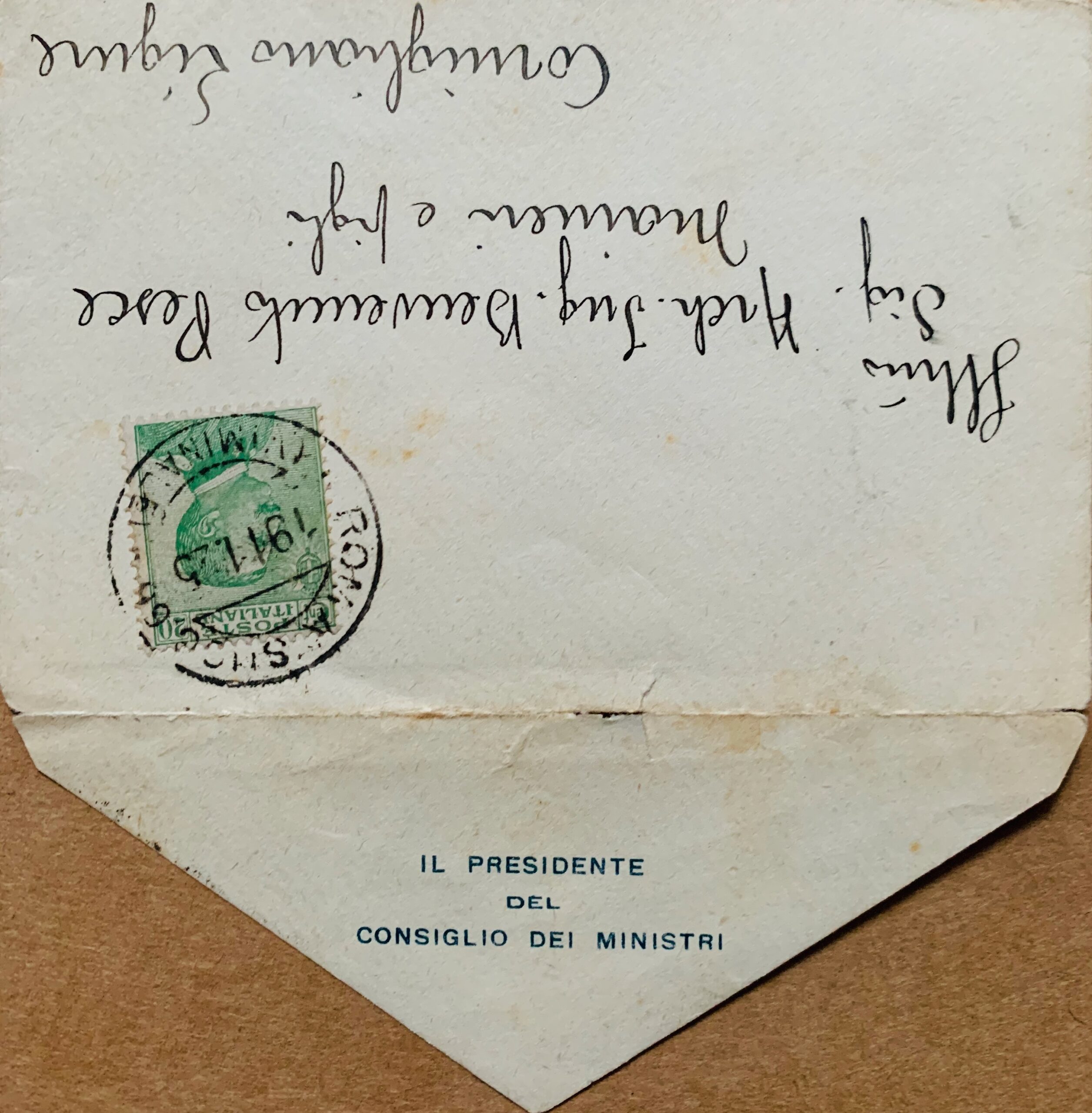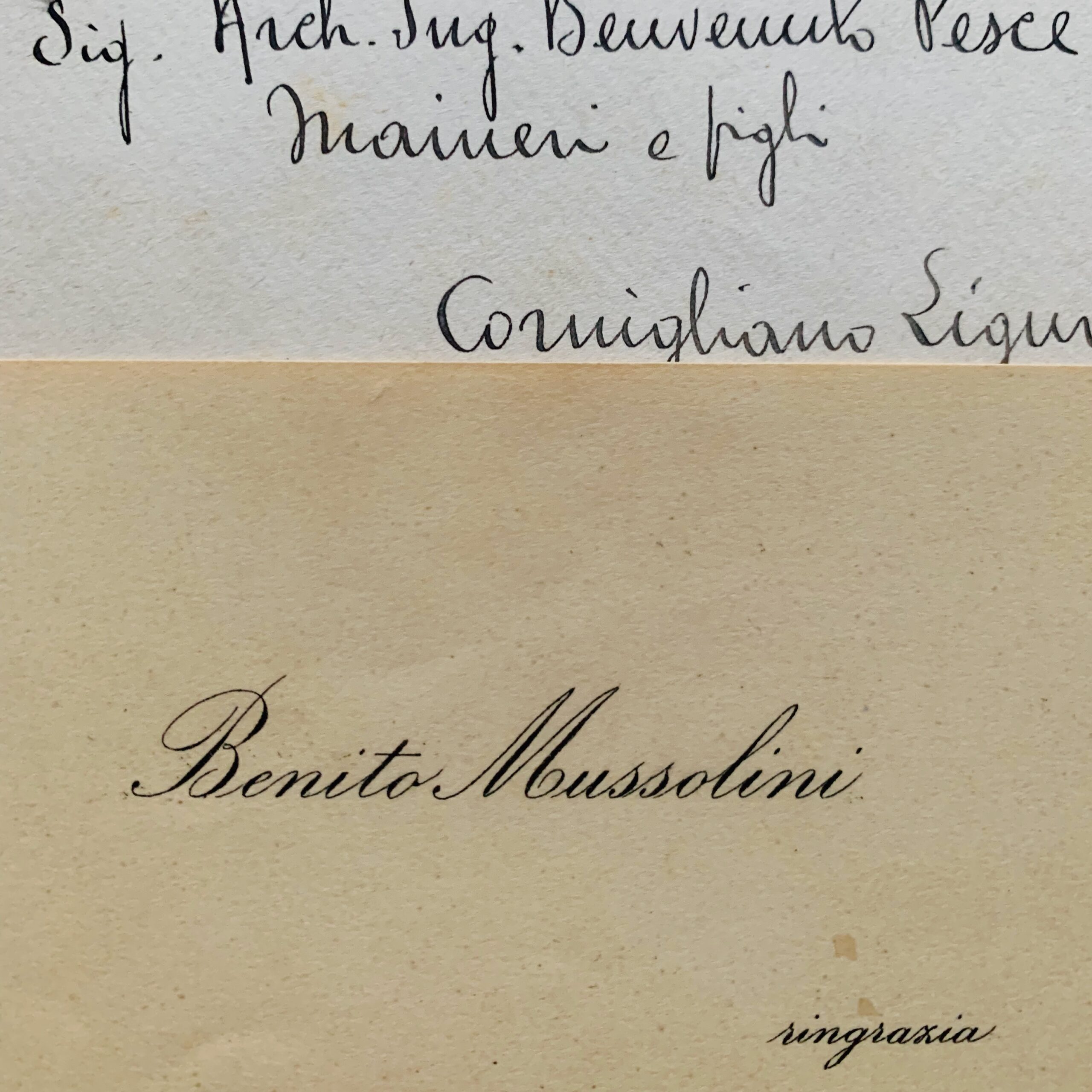 Carte de visite de remerciements "ringrazia" de Benito Mussolini dans une enveloppe "il presidente Del Consiglio dei Ministri", adressée à l'architecte italien Benvenuto Pesce Maineri.