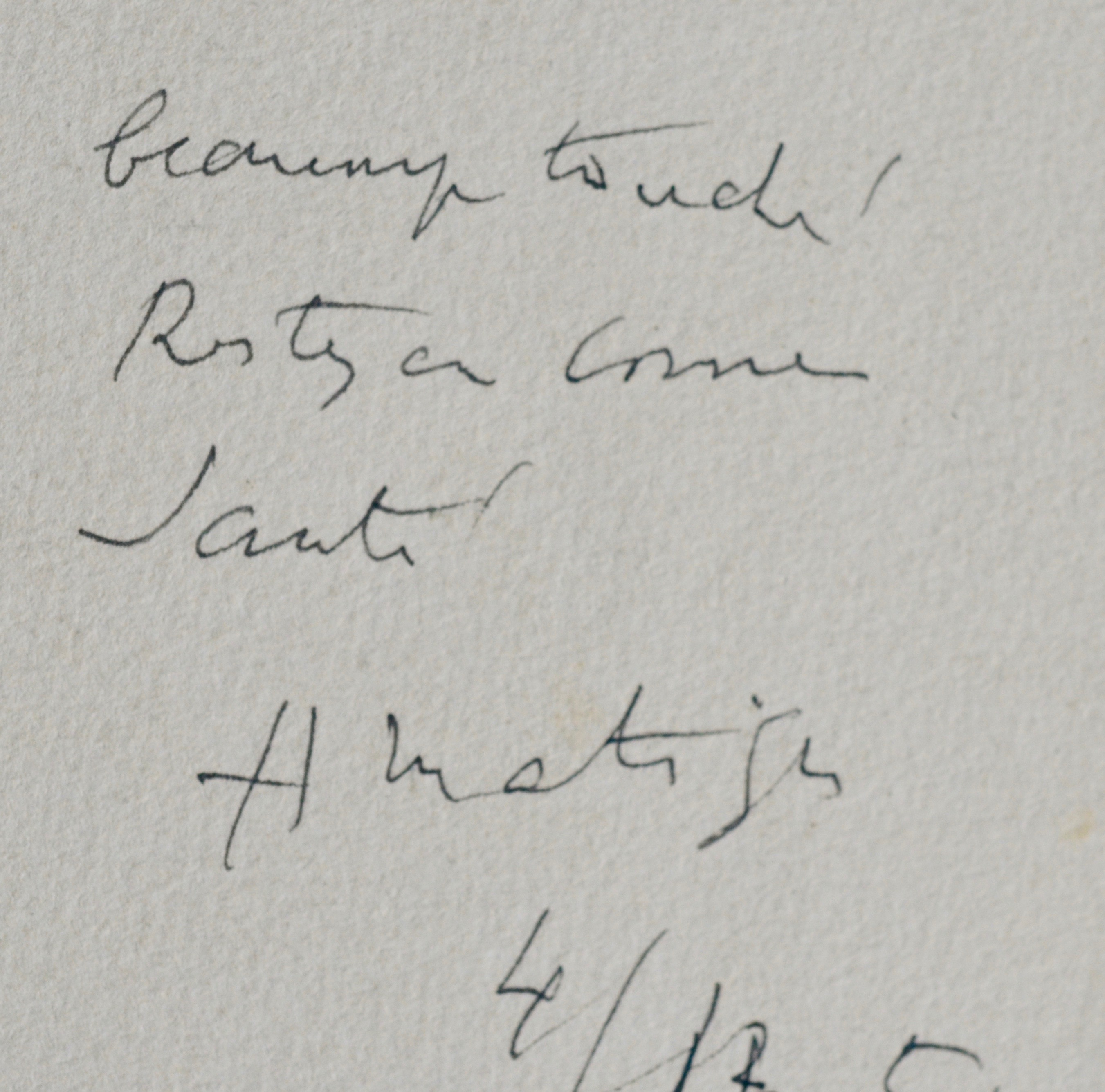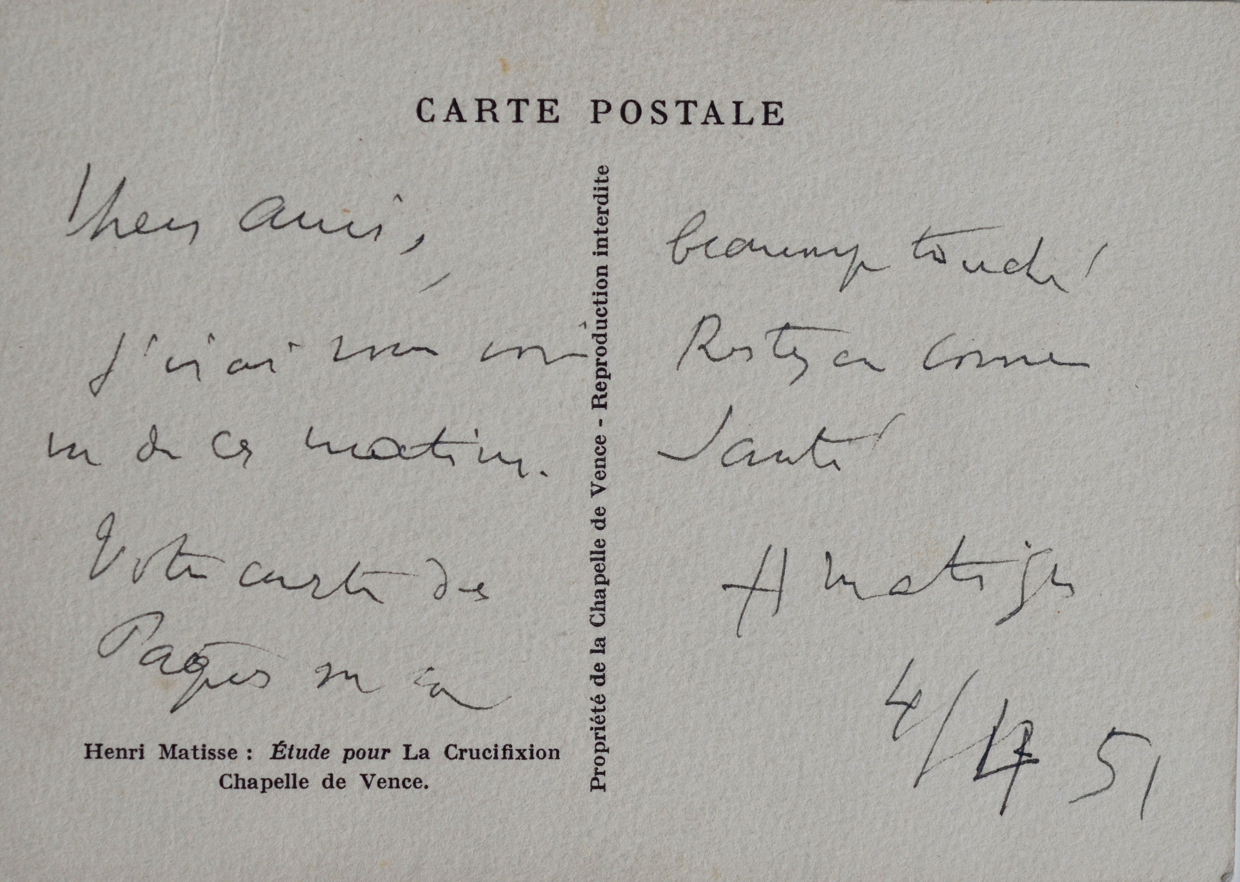 "Chers amis, j’irai vous voir un de ces matins. Votre carte de Pâques m’a beaucoup touché ! Restez en bonne santé ! H Matisse".