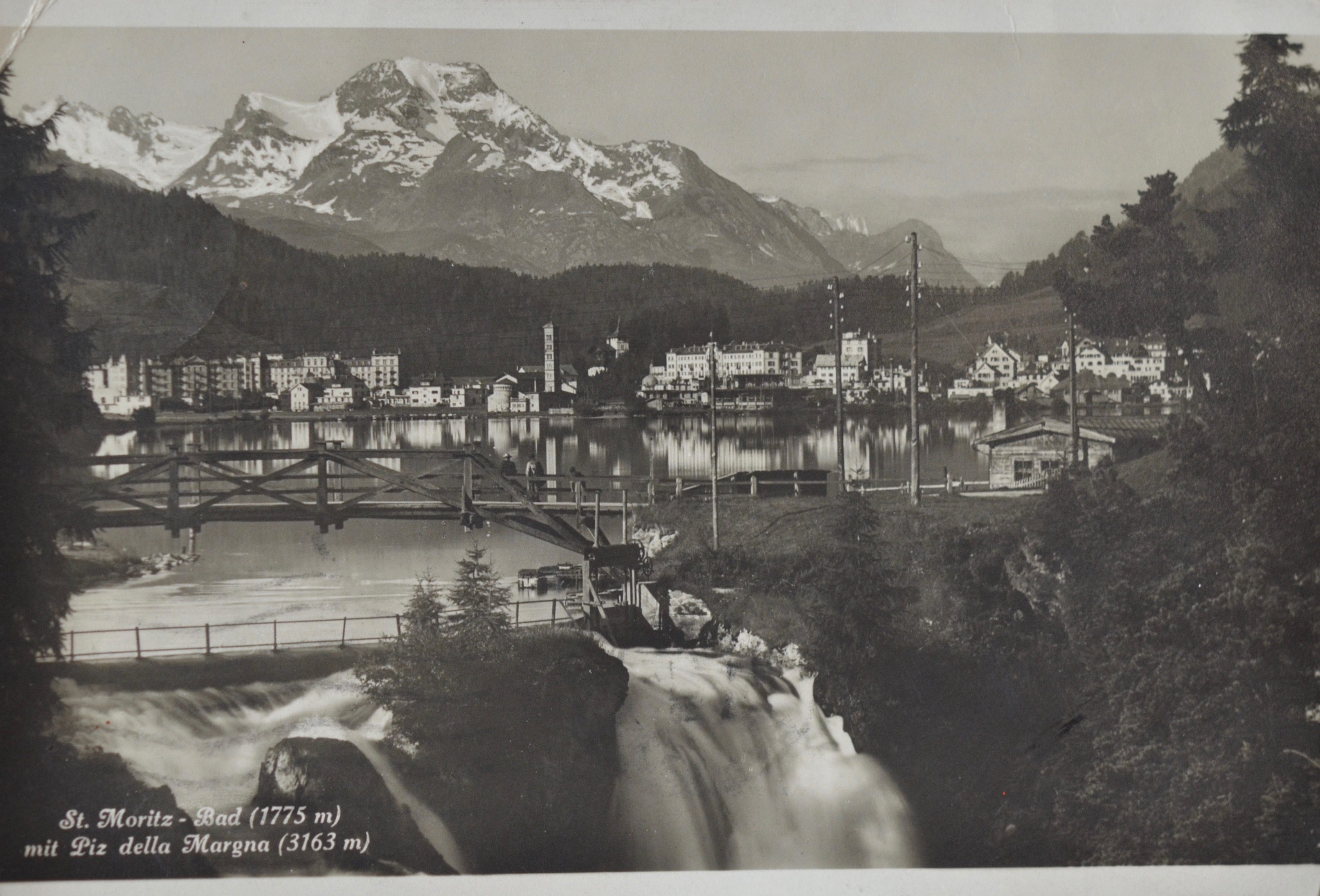 Timbre suisse oblitéré. Le recto de la carte représente le village de Saint Moritz.