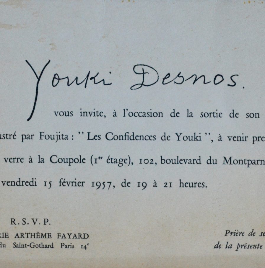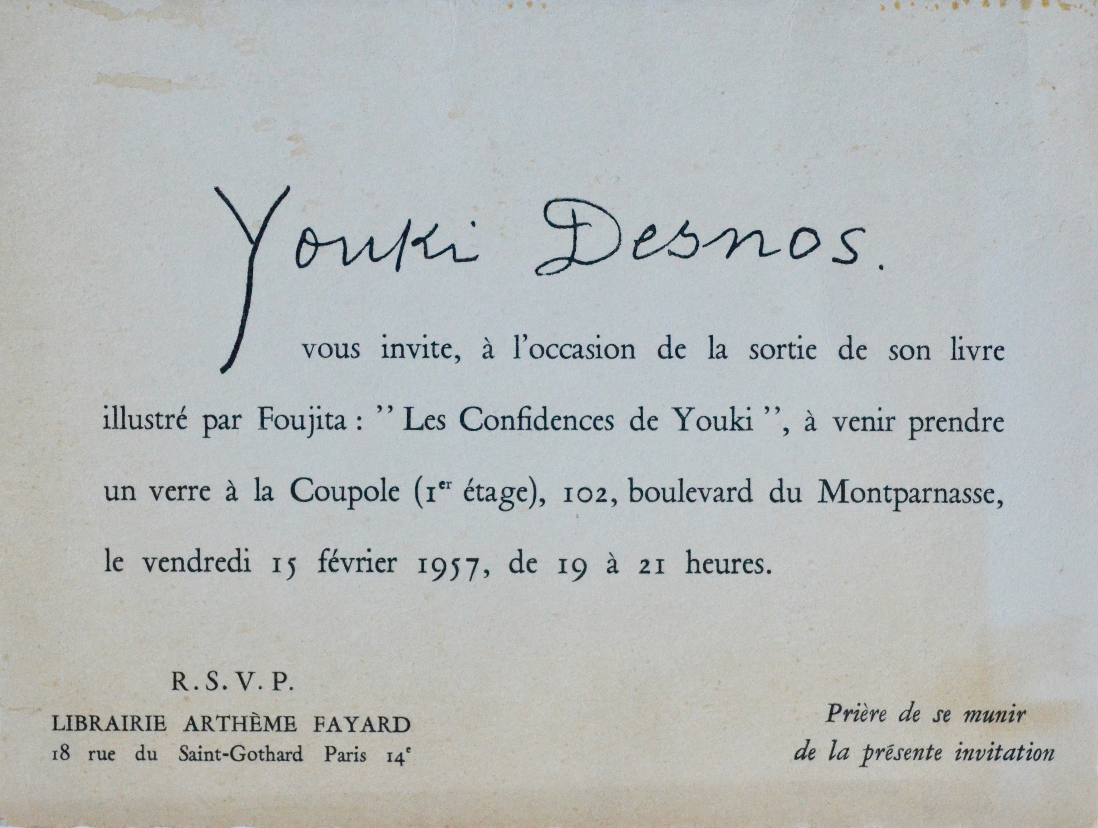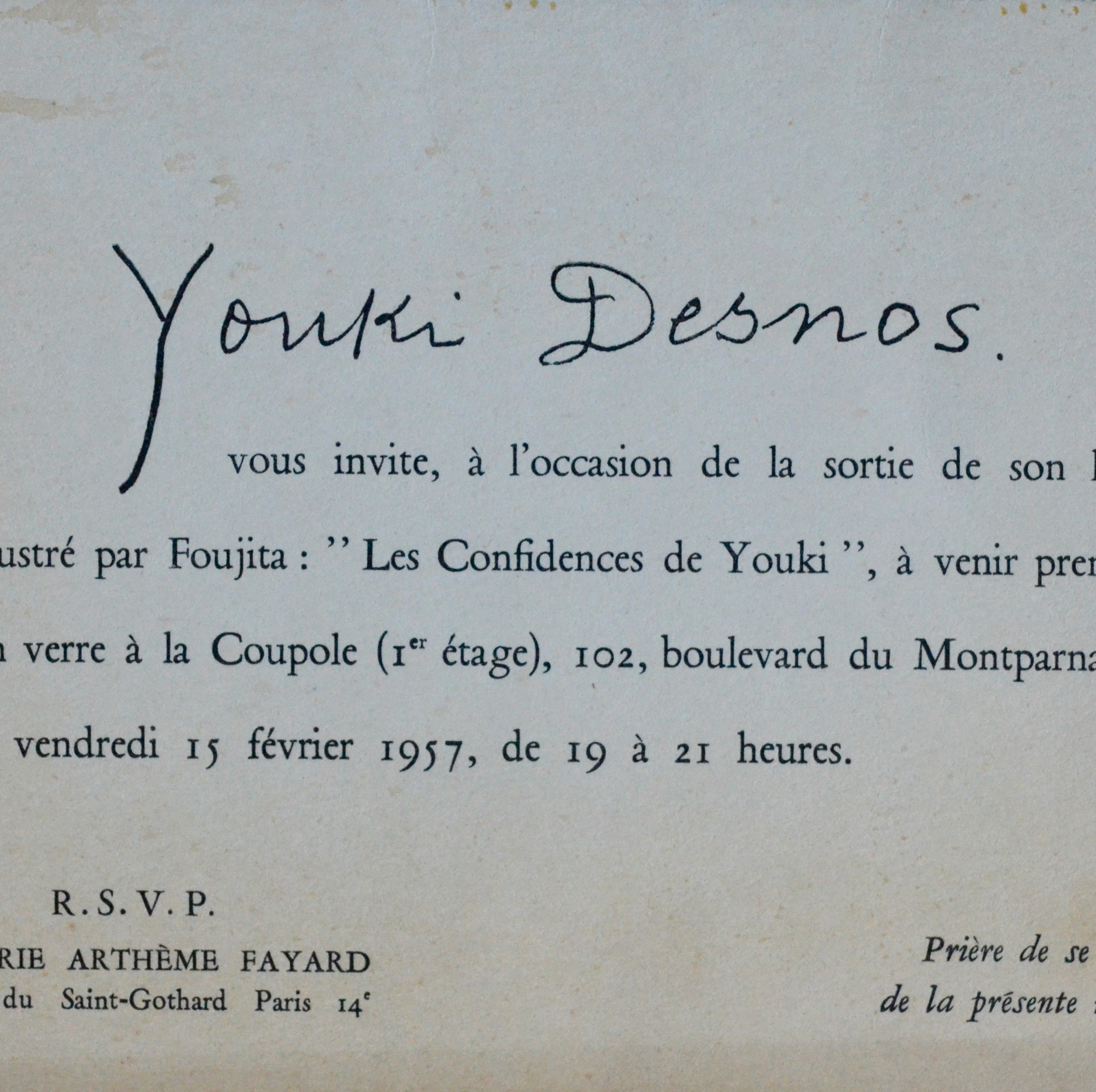 "Youki Desnos vous invite, à l'occasion de la sortie de son livre illustré par Foujita : "Les Confidences de Youki", à venir prendre un verre à la Coupole [...] le vendredi 15 février 1957, de 19 à 21 heures".