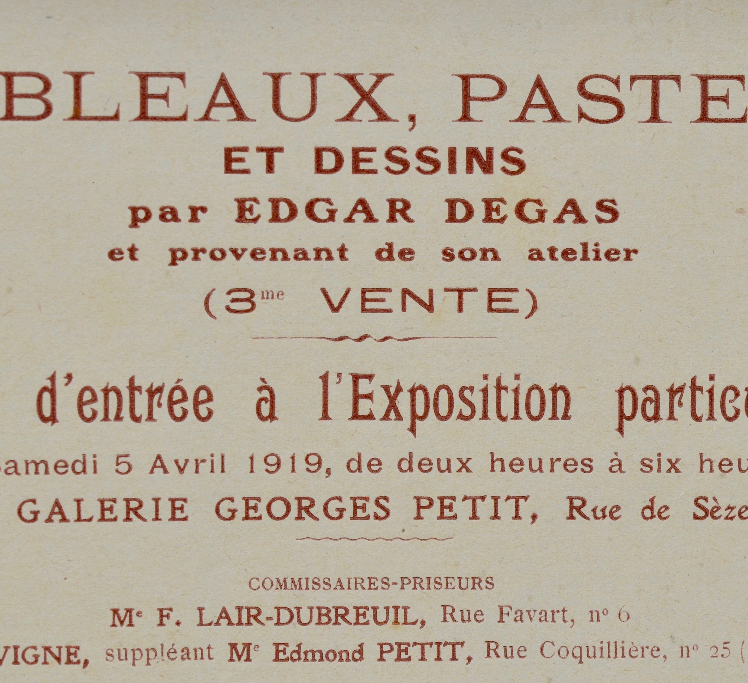Carton d'invitation pour l’exposition de la galerie Georges Petit des œuvres proposées pour la 3e vente des tableaux de Degas, le 5 avril 1919.