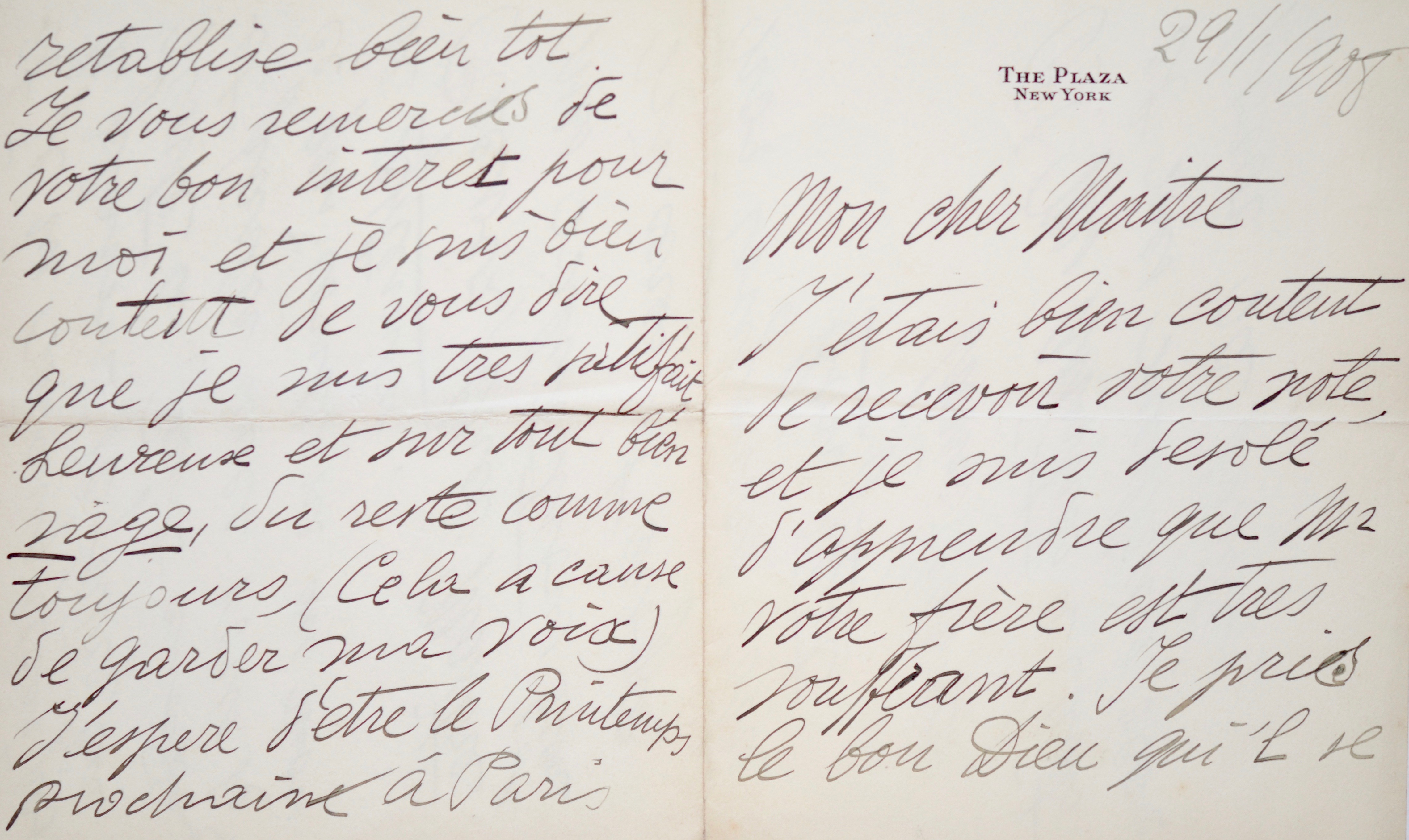 Jolie lettre de Caruso, écrite de New York lors de sa tournée aux Etats-Unis, période glorieuse de sa carrière. "J'étais bien content de recevoir votre note, et je suis désolé d'apprendre que Mr votre frère est très souffrant [Coquelin cadet, qui est alors interné à la maison de santé de Suresnes où il mourra peu après]. Je prie le bon Dieu qu'il se rétablisse bientôt. Je vous remercie de votre bon intérêt pour moi et je suis bien content de vous dire que je suis très satisfait, heureux et surtout bien sage, du reste comme toujours (cela à cause de garder ma voix). J'espère d'être au printemps prochain à Paris et je ne manquerai pas le plaisir de faire la visite à Pont aux Dames et parler avec vous de ce qui concerne au mois de septembre [...]".