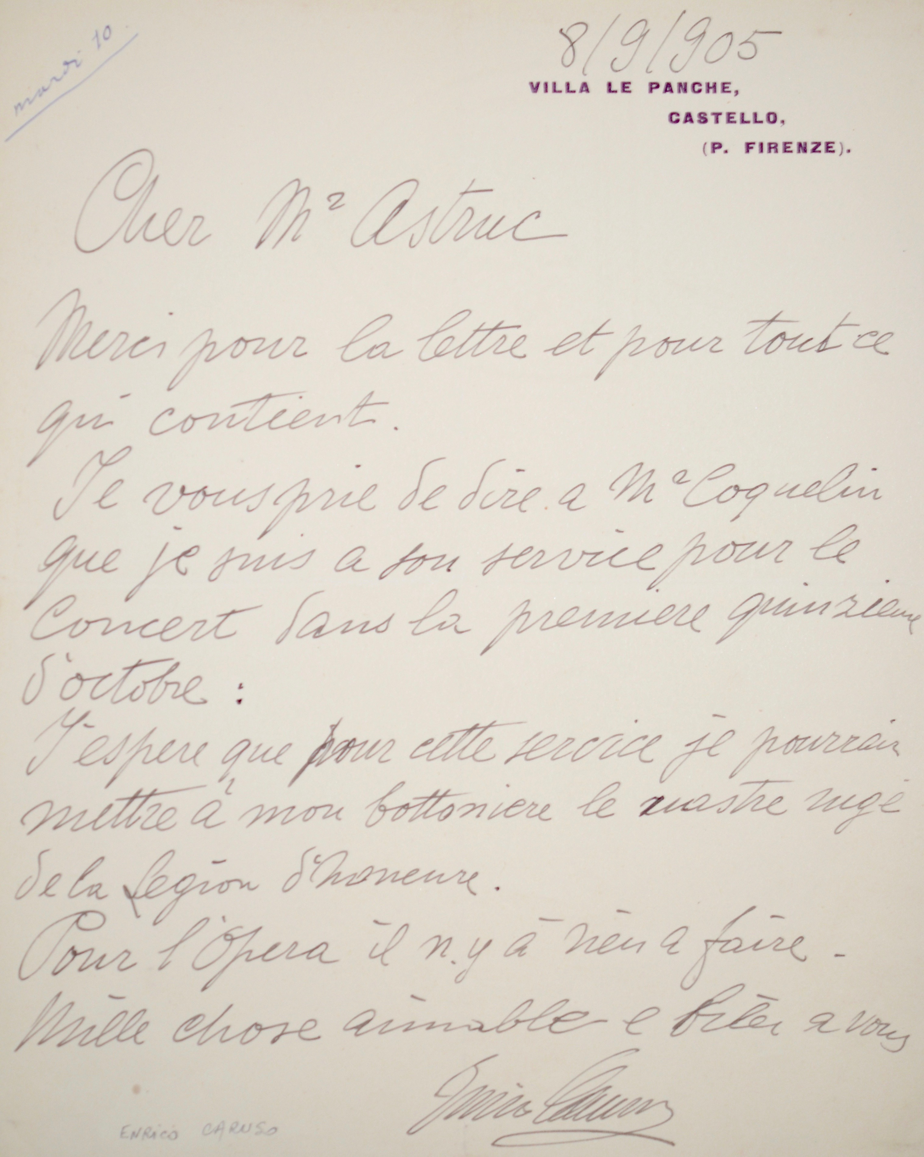 Cette lettre de Caruso, précisément datée de 1905, s'inscrit dans cette "Grande saison". "Merci pour la lettre et pour tout ce qui contient. Je vous prie de dire à M. Coquelin que je suis à son service pour le concert dans la première quinzaine d'octobre. J'espère que pour cette service je pourrai mettre à mon bouttonière le ruastre rugé de la légion d'honneure. Pour l'Opéra il n'y a rien à faire [...]".