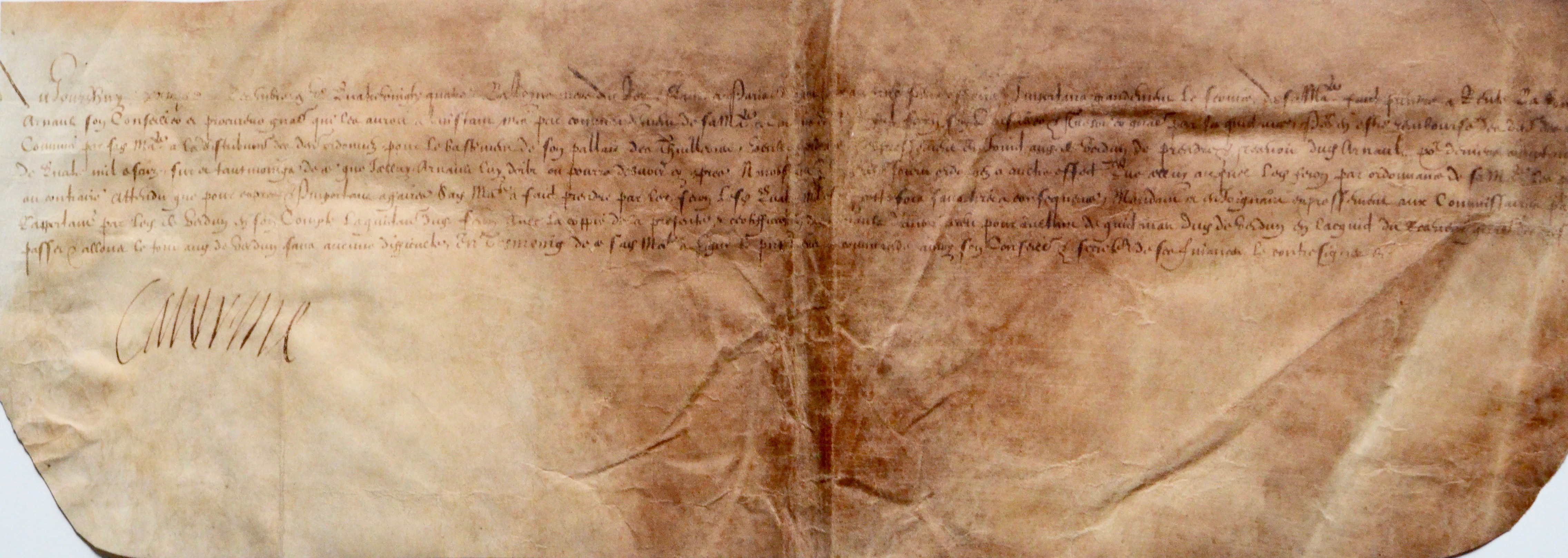 "Aujourd’huy xxiii decembre 1584, la Royne mère du Roy estant à Paris [...] pour affaire important grandement le service de sa Majesté faict prendre à rente la somme de quatre m[lacune]. [...] Arnault son conseiller et procureur général qui les auroit à l’instant mis par commandement de Sa Majesté en mains de [Raoul Le] Feron son conseiller et trésorier général par la quictance, pour en estre remboursé des dits décomptes [...]. Commis par sad. Majesté à la distribution des deniers ordinaires pour le bastiment de son pallais des Thuilleries, [...] enjoinct aud. de Verdun de prendre et savoir [?] dudict Arnault pour deniers comptants et quittance [...]. De quatre mil escuz sur et tant [?] de ce que icelluy Arnault luy doibs ou pourra debvoir cy après nonobstant [...] ordonnez à aultres effect que celluy auquel led. feron par ordonnance de Sa Majesté les pourra employer [...]. Au contraire attendu que pour expres et importantes affaires sad. Majesté a faict prendre par led. feron lesdicts quatre mil escuz cette fois sans tirer à conséquence, mandant et enjoignant empressement aux commissaires par elle establis [...]. Rapportant par led. de Verdun en son compte la quictance dudict feron avec la coppie de la présente et certification [...] d’avoir receu pour aultant de quictance dudict de Verdun en l’acquit du receveur général des [...]. Passé et allouer le tout aud. de Verdun sans aucune difficulté. En tesmoing de ce sad. Majesté a signé le présent […] commandé ainsy son conseiller & secrétaire de ses finances le contresigner".