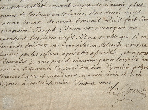 Charles Court (Caton de) (Pont-de-Vaux, 1654/1694)Caton de Court évoque quelques connaissances communes et les difficultés rencontrées par Toinard pour publier son dernier ouvrage. «M. de Meaux a parcouru vostre ouvrage et en a compris le mérite. Mais par malheur, il n'est pas de l'assemblée du clergé. Pour moi, tout ce que je puis vous en dire, c'est que je voudrois bien qu'il fût imprimé aussi bien que ses semblables. Vous m'avés bien la mine de faire enfin un voïage à Amsterdam et il me semble que vous fairiés bien. Car les autheurs de vostre habileté courent risque de n'avoir plus guère de lecteurs en France. Vous devez vous savoir bon gré de vostre travail. Qu'il fait bien connoistre Joseph ! Toutes vos remarques me paroissent très justes aussi. Il me semble que si on demande toujours vos Evangiles en Hollande, vous ne devriés pas les refuser auprès cette assemblée [...]».