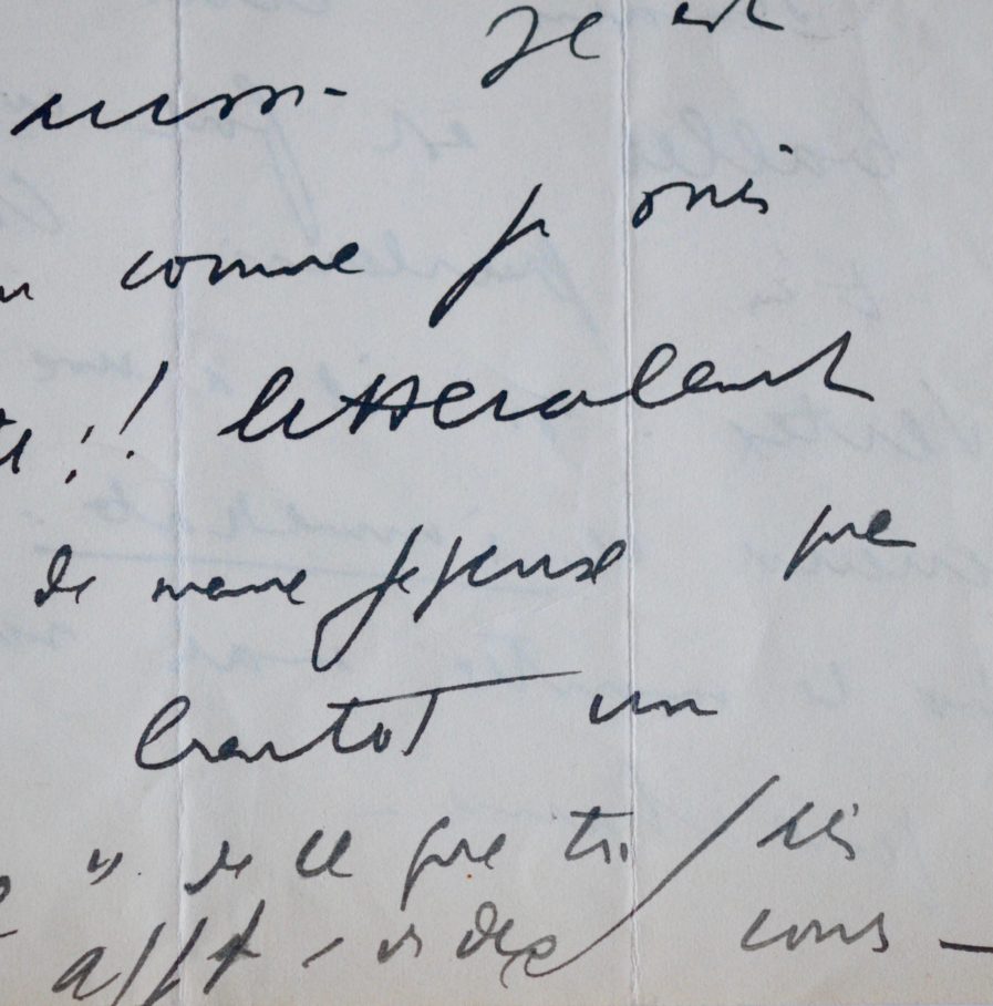 "Je commence à reprendre un peu souffle et vous écris aussitôt. J'ai vu Blum à Londres et le reverrai demain. Cette manigance de ballet est fort compliquée. Je t'en parlerai et verrai Vertex, si il a une offre vraiment sérieuse et immédiate. Blum insiste pour le monter mais seulement l'année prochaine. Comment vont tes affaires ? Voici l'été. Si tu est gentil pense bien à Nane Germon [maîtresse de Céline] 5 square Migniot Paris. Il vient encore de lui arriver un pépin. J'ai vu Mahé avant de partir en pleine et vigoureuse euphorie. Il va falloir vieux nous convertir à la pêche aussi. Il est temps ! Dieu comme je suis encore abruti !! littéralement gaga ! Tout de même je pense que tu vas recevoir bientôt un exemplaire "luxe" de ce que tu sais".