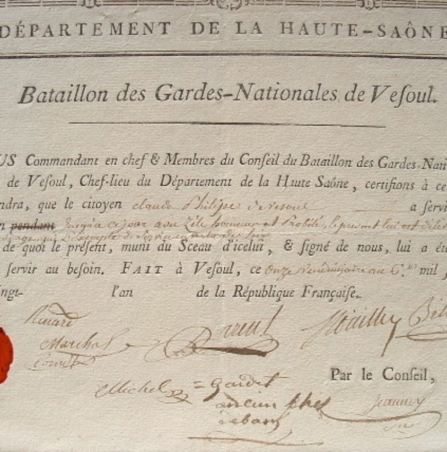 Certificat de la Garde Nationale de Vesoul, signé par le commandant en chef et les membres du Conseil du bataillon, en faveur du citoyen Claude Philipe qui a «servi dans ce bataillon jusqu'à ce jour avec zèle, honneur et probité».