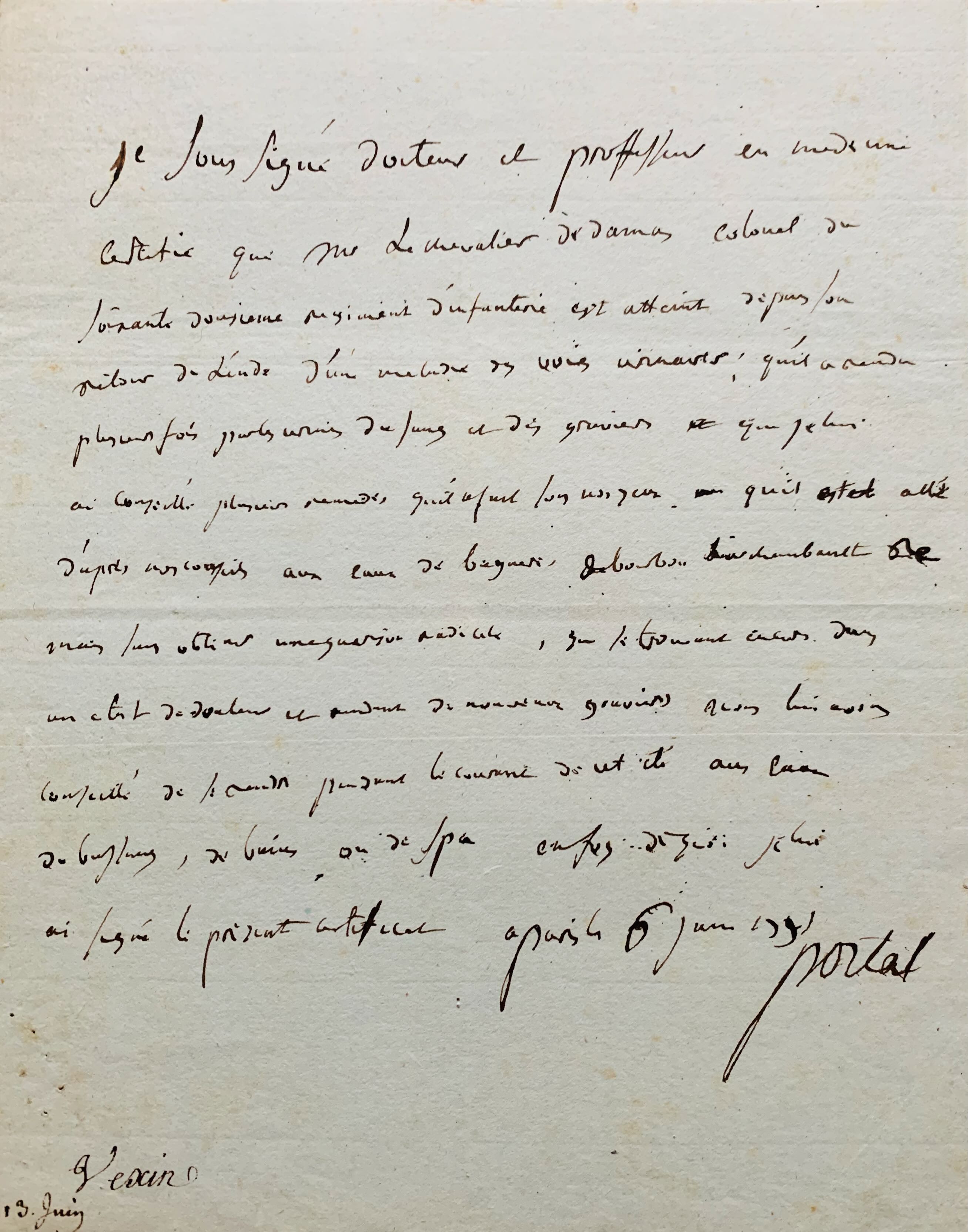 Certificat de maladie urinaire dressé par le baron Antoine Portal, pour le chevalier de Damas