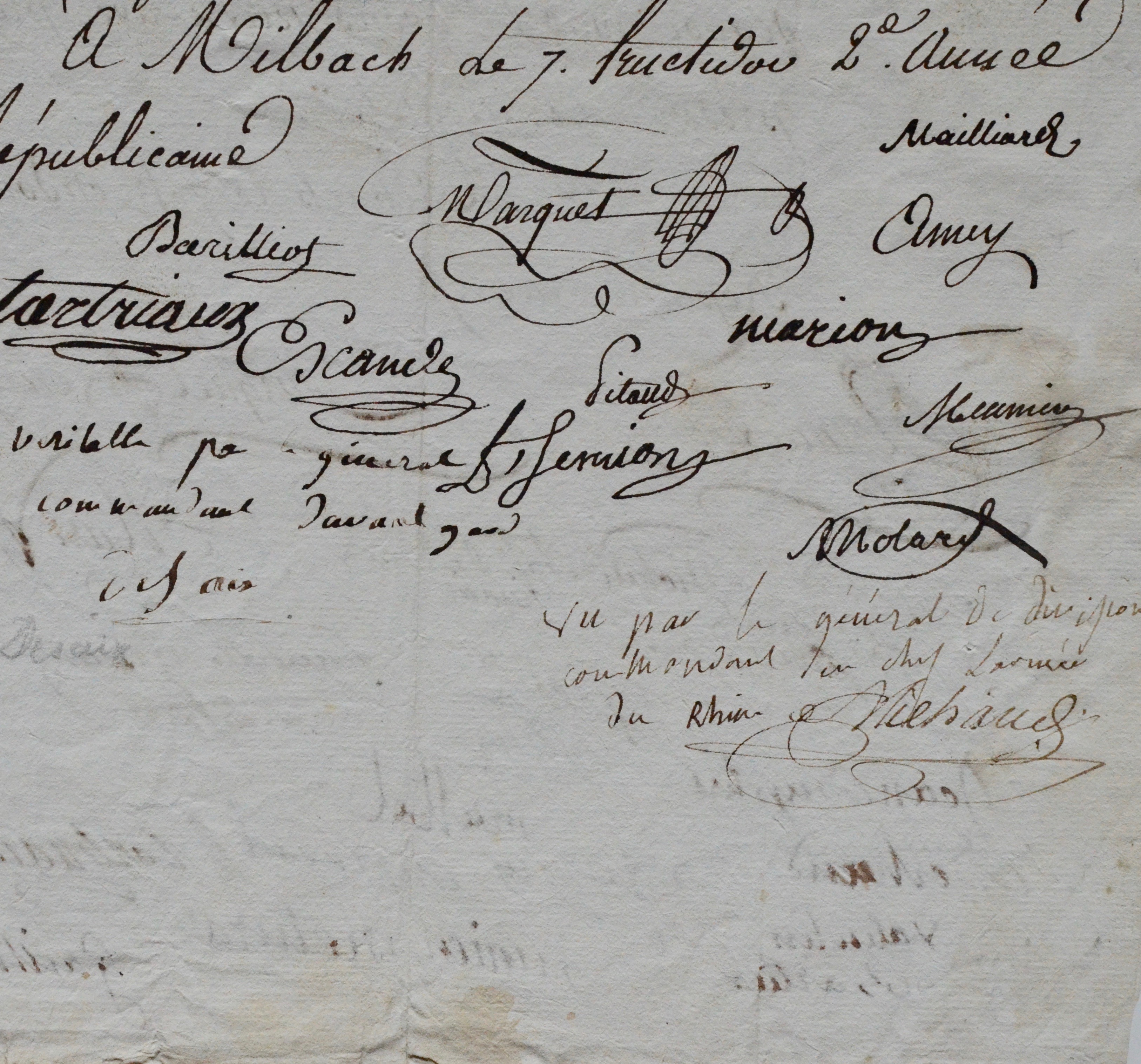 Très nombreuses signatures (plus de 40) dont celles du général Desaix (avec ajout autographe "vu et certifié véritable par le général de division commandant l'avant garde") et celle du général Michaud (avec ajout autographe "vu par le général de division commandant en chef l'armée du Rhin").