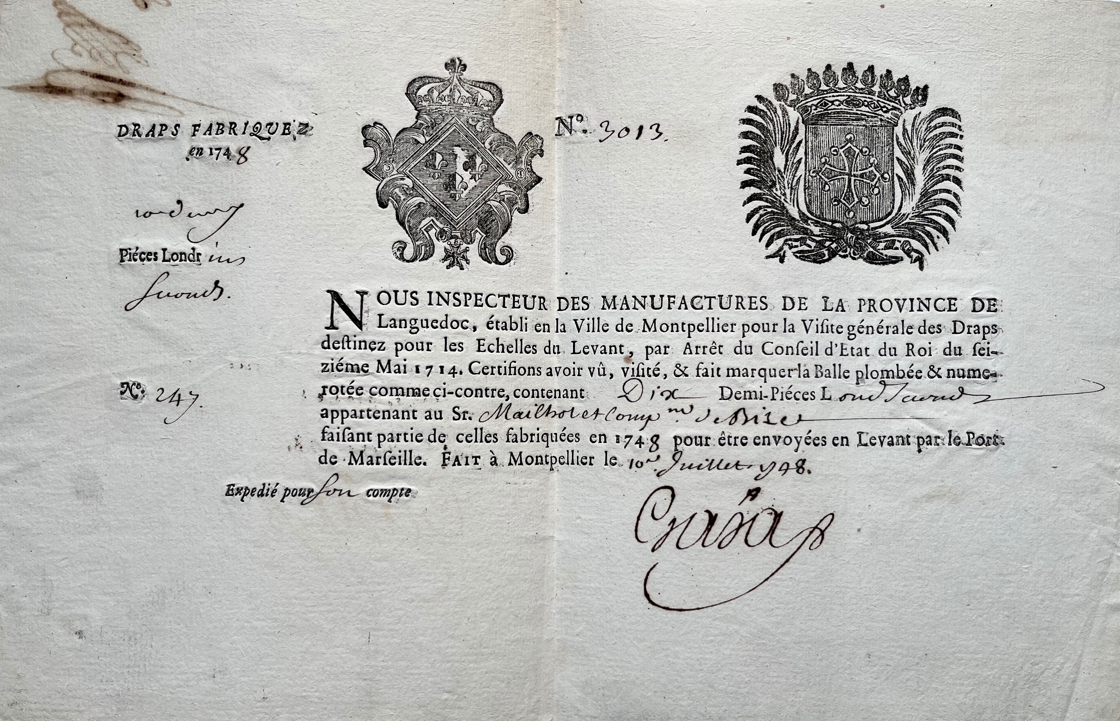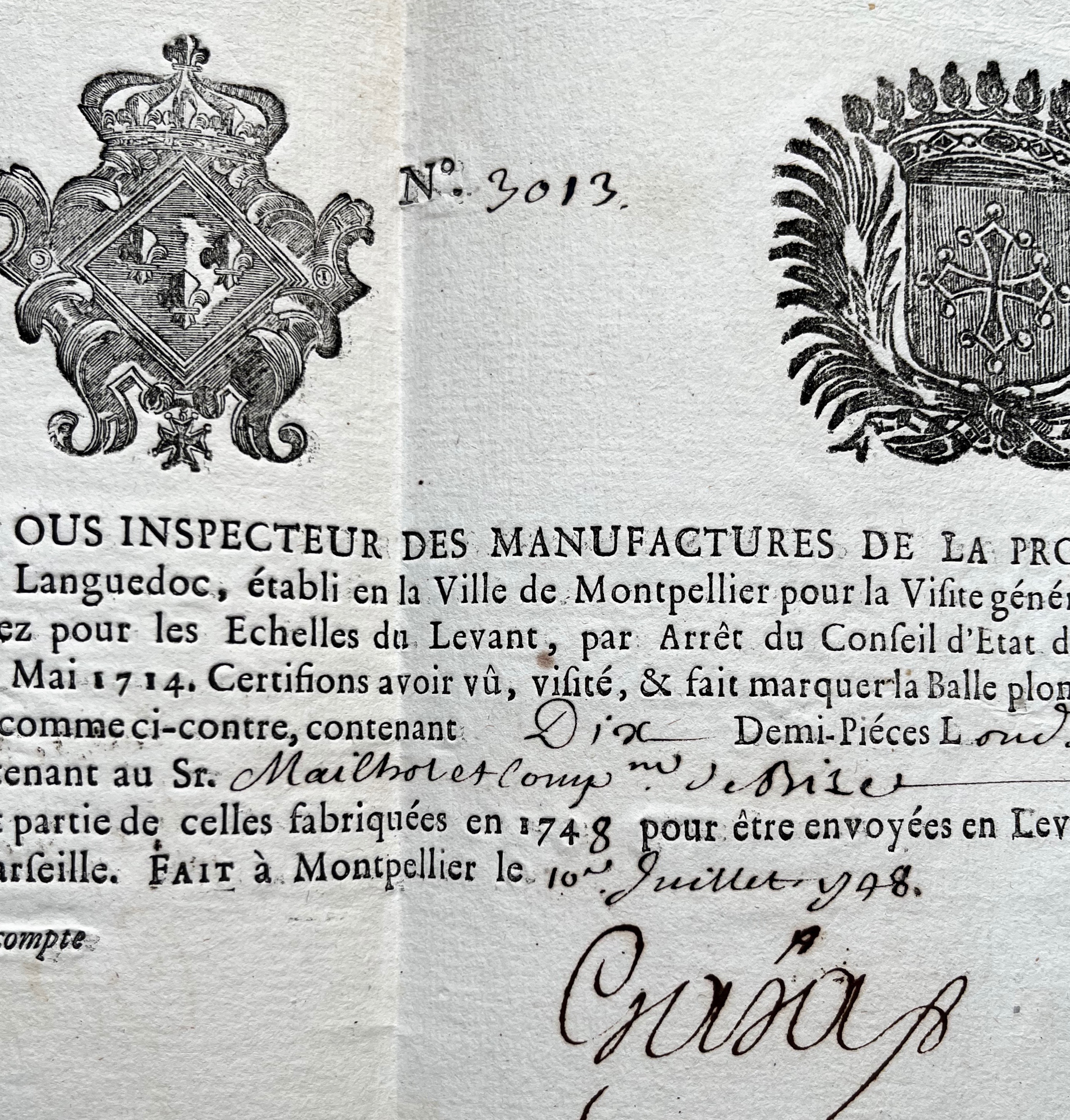 Pièce signée par l’inspecteur des manufactures de la province de Languedoc, en partie imprimée, avec deux grandes vignettes gravées.