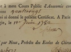 Certificat signé par le grand chirurgien Sabatier, attestant que le sieur Le Bel "a assisté exactement à mon cours public d'Anatomie complet pendant l'année mil sept cent quatre vingt". Document contresigné par Mardon et De Villiers "prévôts des Ecoles de Chirurgie".
