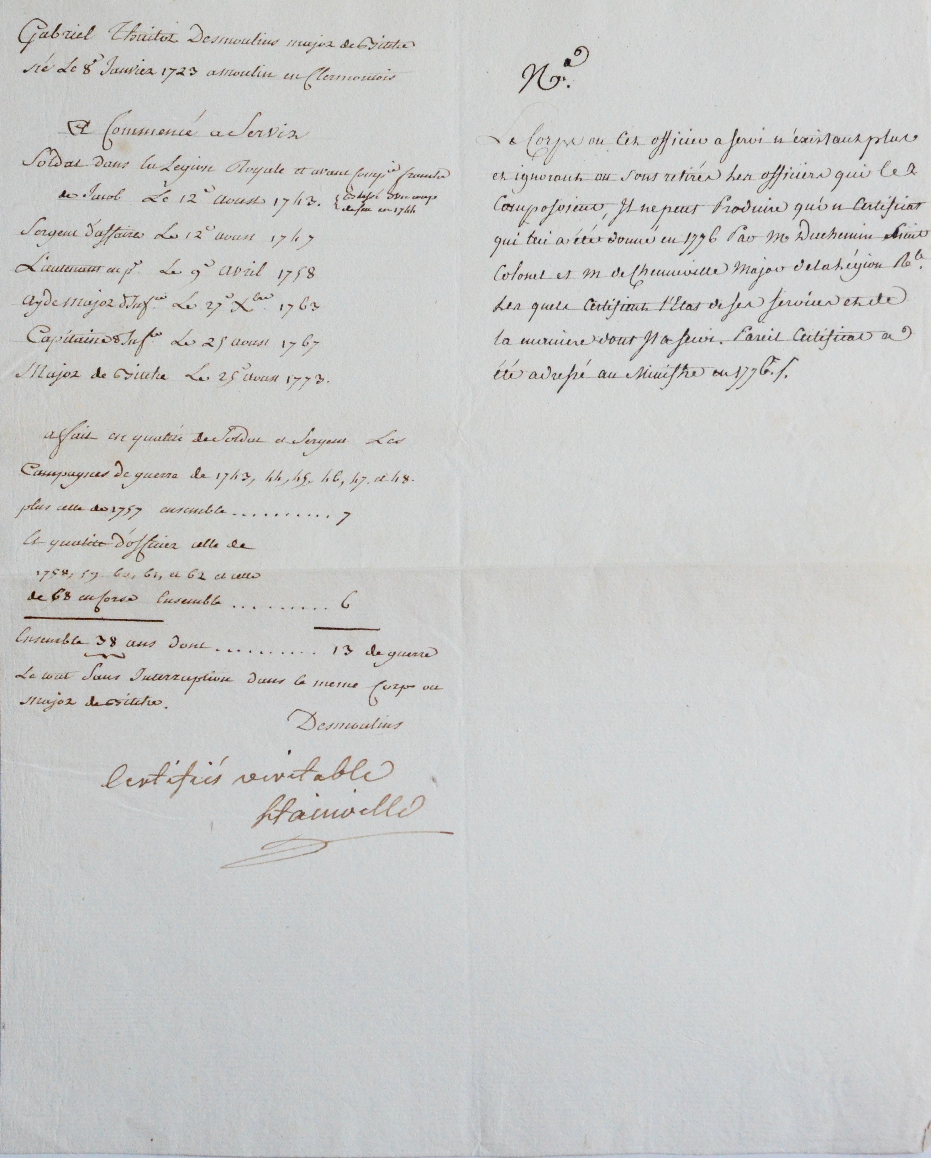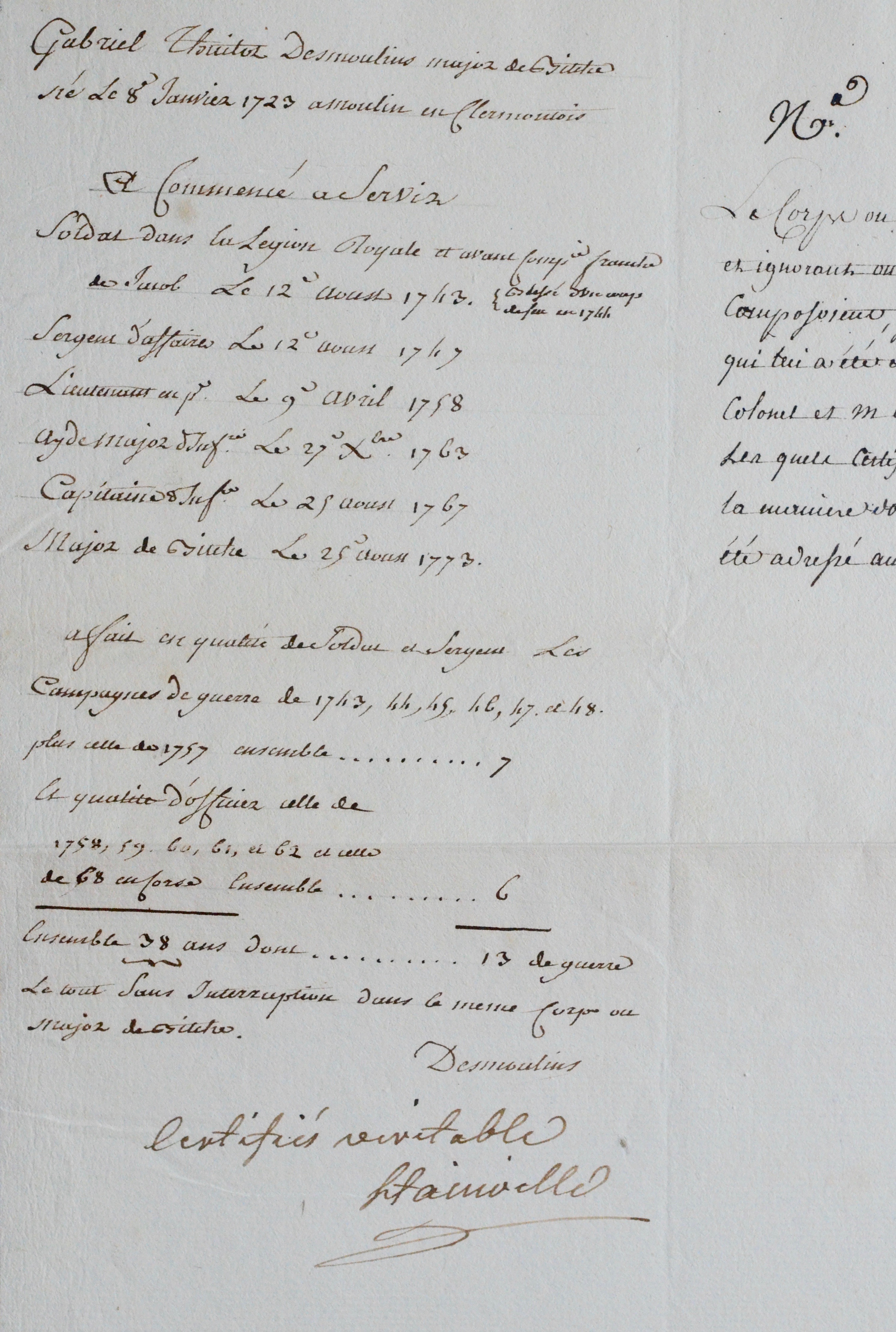 Certificat d'états de service de Gabriel Thuitot Desmoulins, major de Bitche, né le 8 janvier 1723 à Moulin-en-Clermontois. Il fut soldat dans différents corps d'armée, puis sergent, lieutenant, aide-major, capitaine, etc, et servit dans les compagnes en Corse ou à Bitche, de 1743 à 1768, soit 38 ans de service dont 13 de guerre.